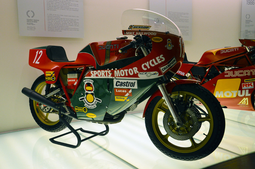 L'exposition passe ensuite par un petit couloir expliquant les débuts de la marque fondée en 1926 pour la construction de composants électroniques. De la grande salle suivante on passe à différentes alcôves retraçant l'évolution des motos, du premier moteur Cucciolo, construit dans l'usine reconstruite après-guerre, et venant se poser sur des cadres de bicyclettes, puis la première vraie Ducati, la 60.