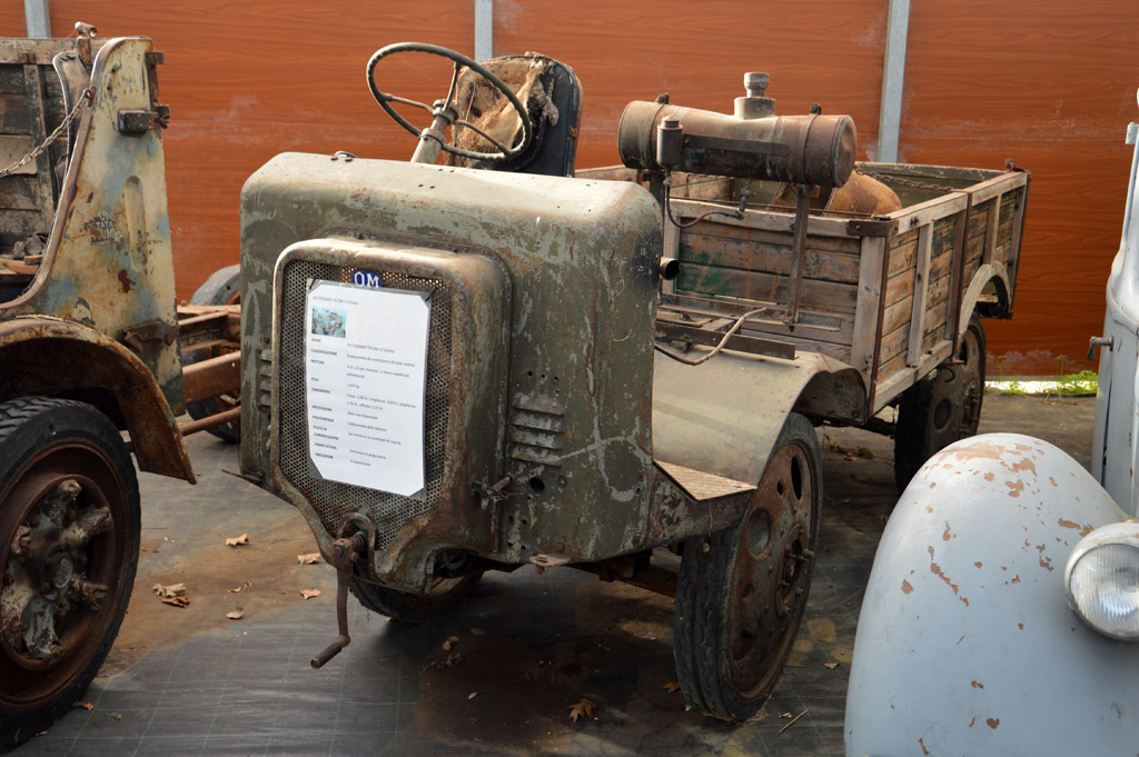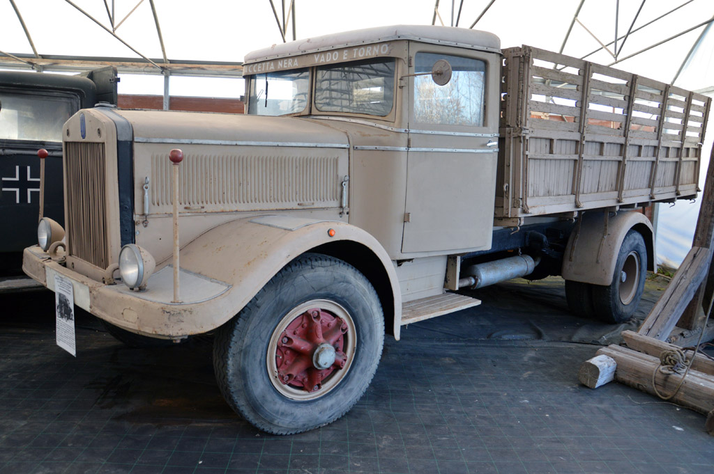 Je me dirige donc tout d'abord sous un premier chapiteau où sont alignés de nombreux véhicules en deux rangées. Une contenant des véhicules de l'Axe : Phänomen Granit 1500, Fiat 508, SPA Pavesi P4/100, SPA CL39, OM 37, Bianchi Miles, un camion suisse Berna, ou encore ce Fiat 634 NM.