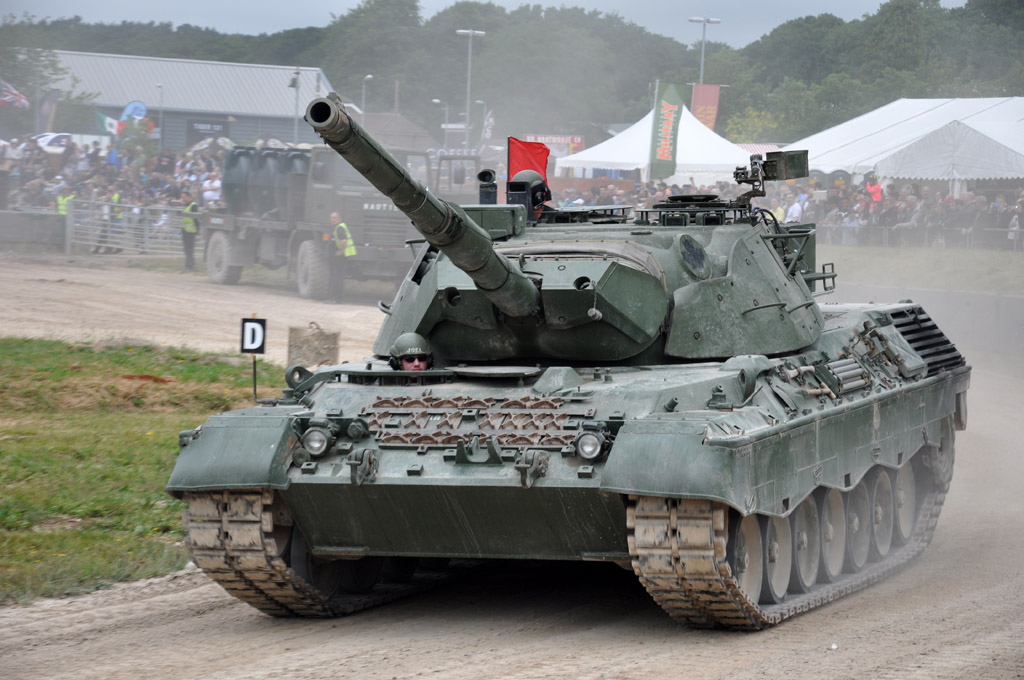 Le Leopard 2 en évolution avec à son bord quelques spectateurs.
