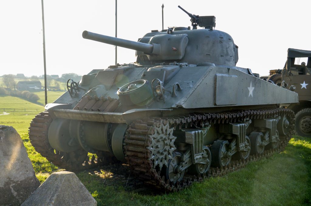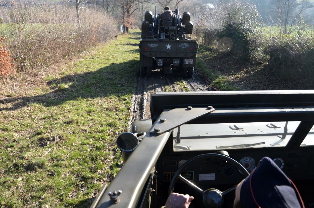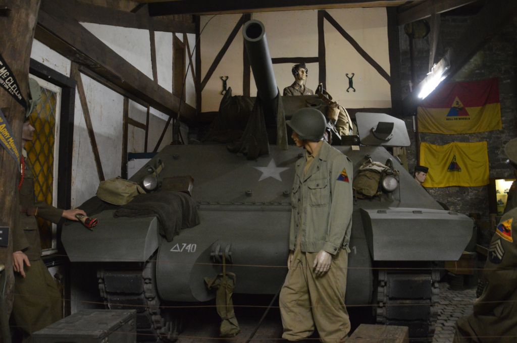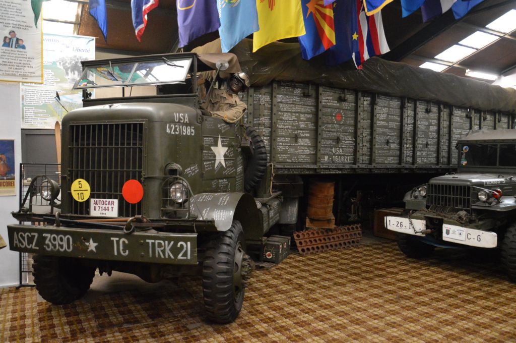 L’après-midi, après un court arrêt pour la pause soupe du midi, le convoi reprit la route en direction du musée Remember 39-45 de Thimister-Clermont. Devant le musée figure tout de même ce Sherman M4A4 équipé encore de son Multibank (mais non fonctionnel). A noter à l'intérieur, cet Autocar U-7144T ou ce faux M36 Jackson en bois.