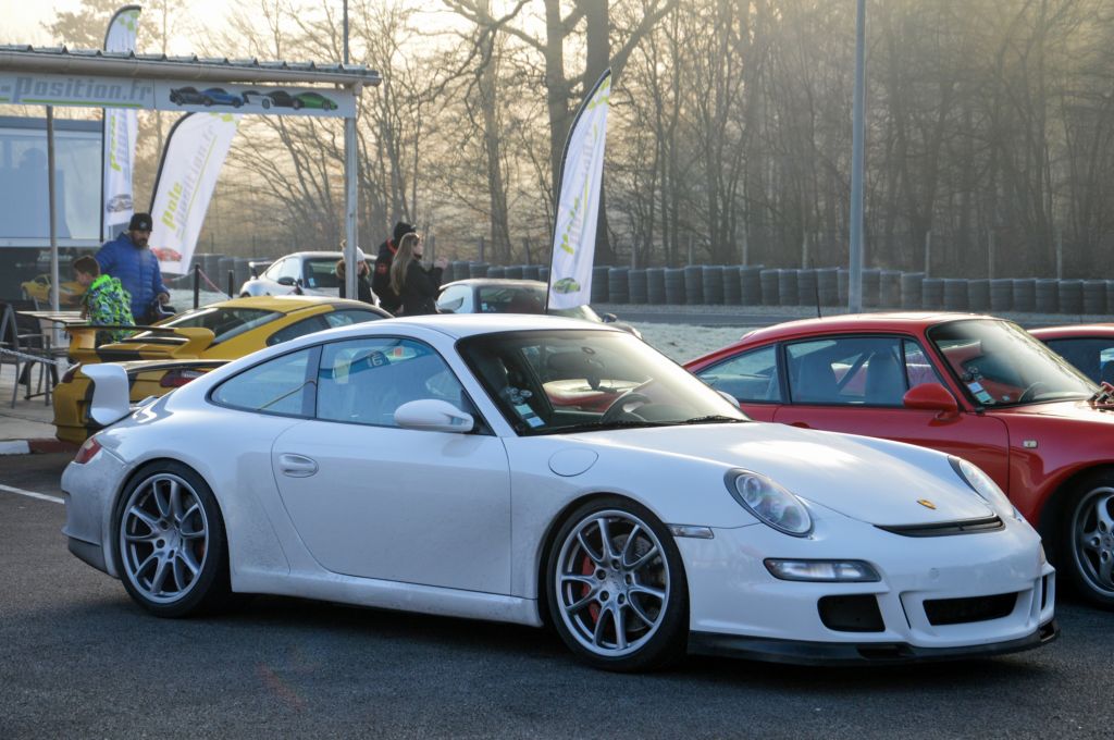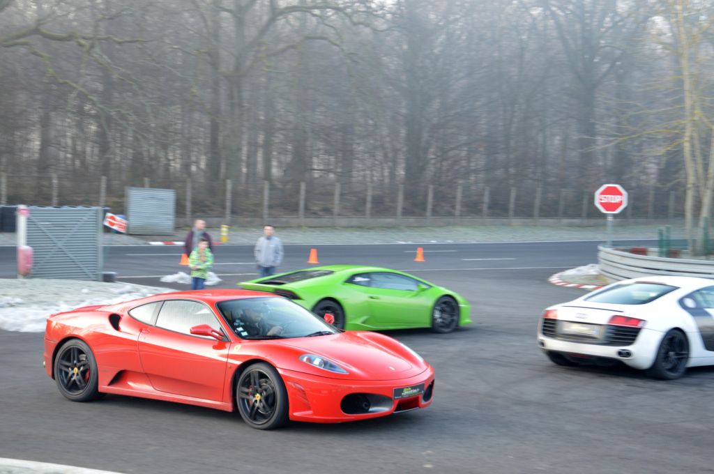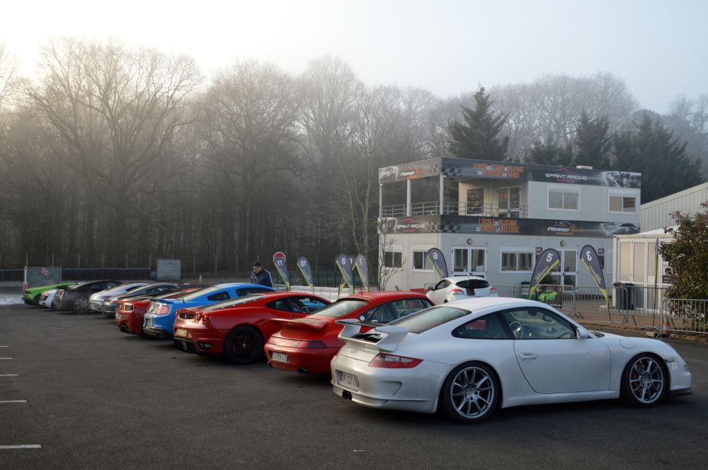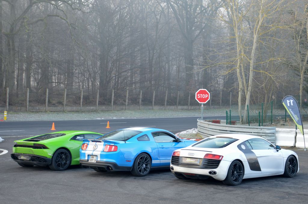 Alors que j'arrive dans le droid d'un dimanche matin de février, les voitures disponibles pour les stages sont en train de chauffer : Ferrari 430 et 458, Mercedes-Benz AMG GT, Nissan GTR, Shelby GT500, Audi R8, Lamborghini Huracan et Gallardo, Renault Mégane RS, Porsche Cayman et bien évidemment, la GT3 que je vais conduire, au premier rang.