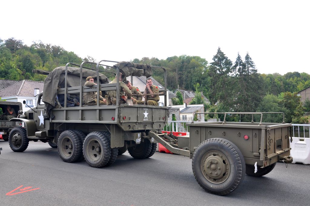 Après renseignement, nous apprenons que les véhicules sont partis en direction de Merbes-le-Château, pour une mise à l'eau des amphibies. Arrivé sur place, nous voyons le dernier véhicule du convoi quitter le lieu. Des passants nous indiquent qu'ils ont pris la direction de Lobbes, et nous les retrouverons en cours de route (enfin une partie, les amphibies étant partis dans une autre direction). On trouvait donc du beau matériel : les habituels Jeep, Dodge et GMC (dont un équipé d'un affût quadruple Maxon, et un autre transportant une Weasel),...