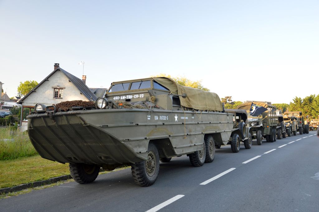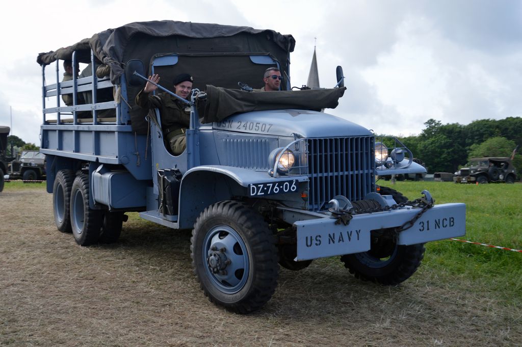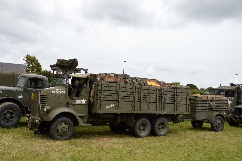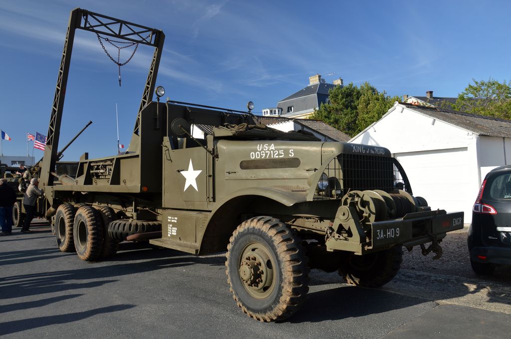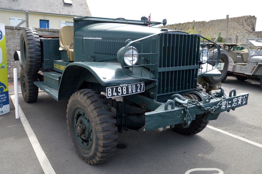En fin d'après-midi, direction Grandcamp-Maisy où un grand défilé est prévu à partir de 20h30 en direction d'Isigny-sur-Mer. Nous rejoignons les véhicules avant le départ. Beaucoup viennent du camp Geronimo, mais il y en a plusieurs que nous n'avions pas encore vu : M26 Pacific (!), GMC CCKW équipé d'un 40mm Bofors, le Brockway B666 déjà vu avec son portique déplié, une DOdge Staff Car, Dodge WC55, Dodge WC64KD, La Salle ambulance, ou encore cette drôle de conversion de Studebaker US6 en 4x4.