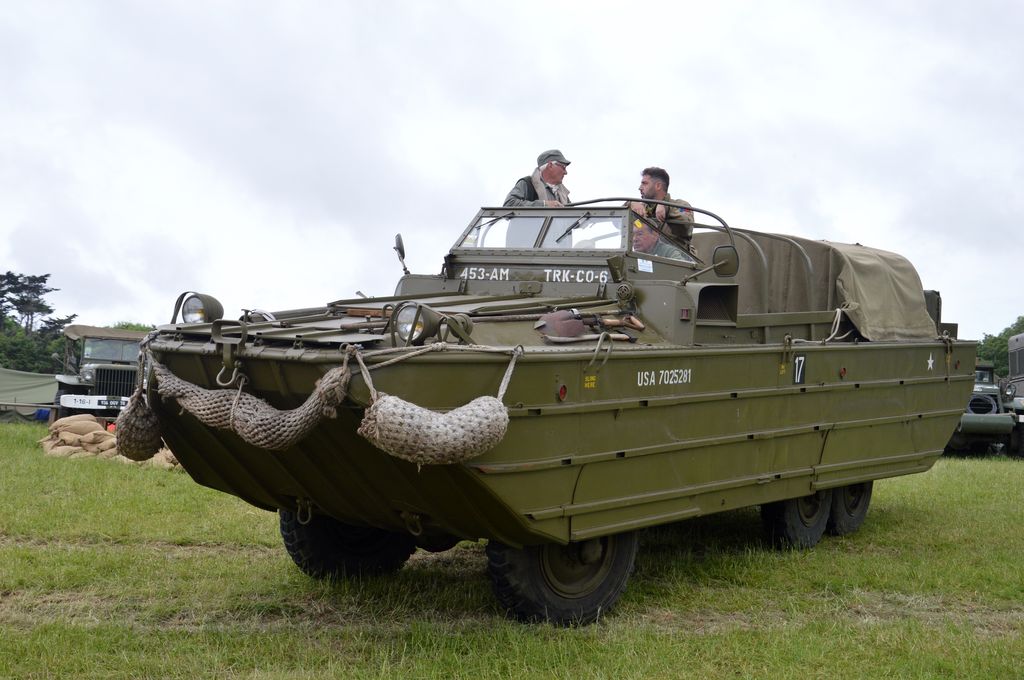 Quelques véhicules de passage : un "Duck", un Chevrolet G-7117, une GMC CCKW transportant une Weasel ou encore des Rafale à très basse altitude !