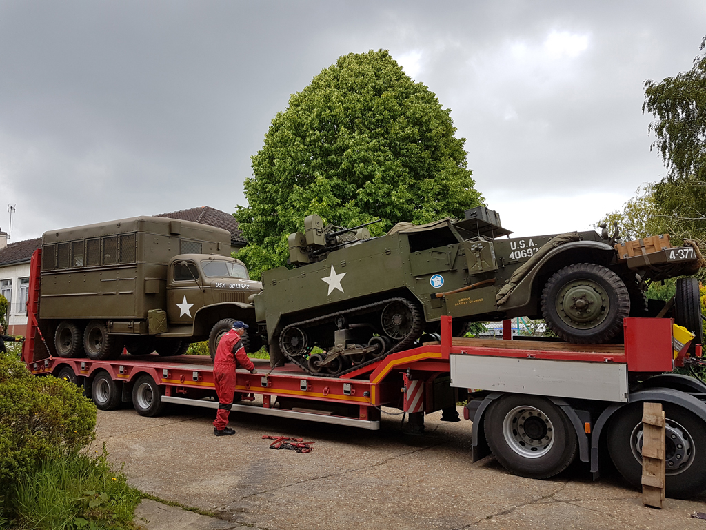 Alors que plusieurs lourds véhicules (GMC CCKW, DUKW et International M426) ont déjà pris la route le lundi 27 juillet, je m'occupe le 28 de charger le Sherman de l'association sur la remorque porte-char qui l'emmènera jusqu'en Normandie, et j'aide à charger les véhicules restants : Half-Track et Scout-Car.