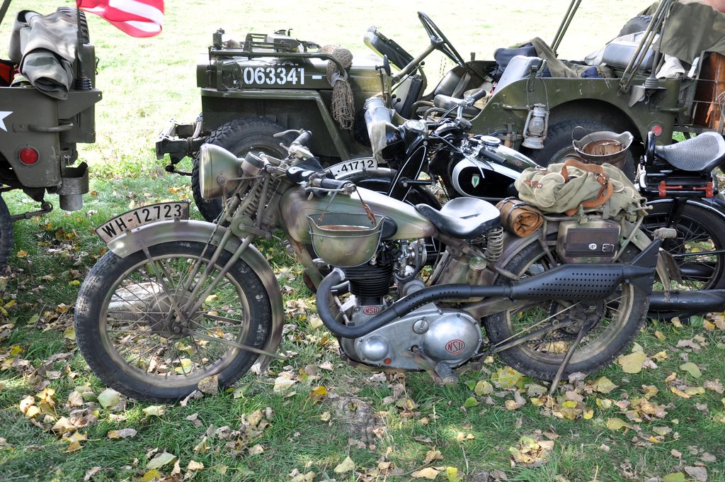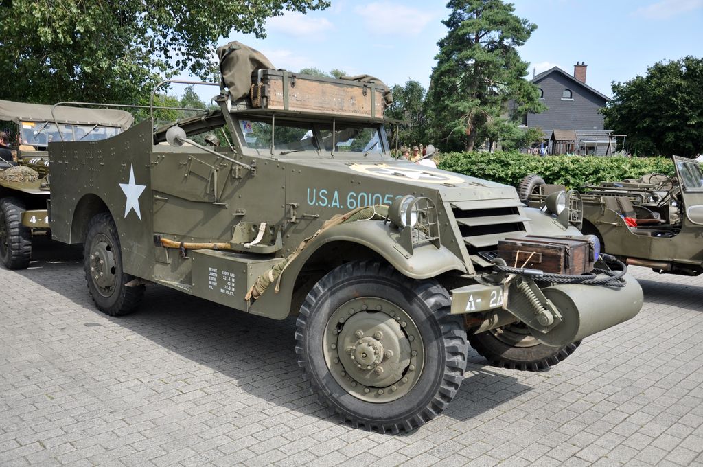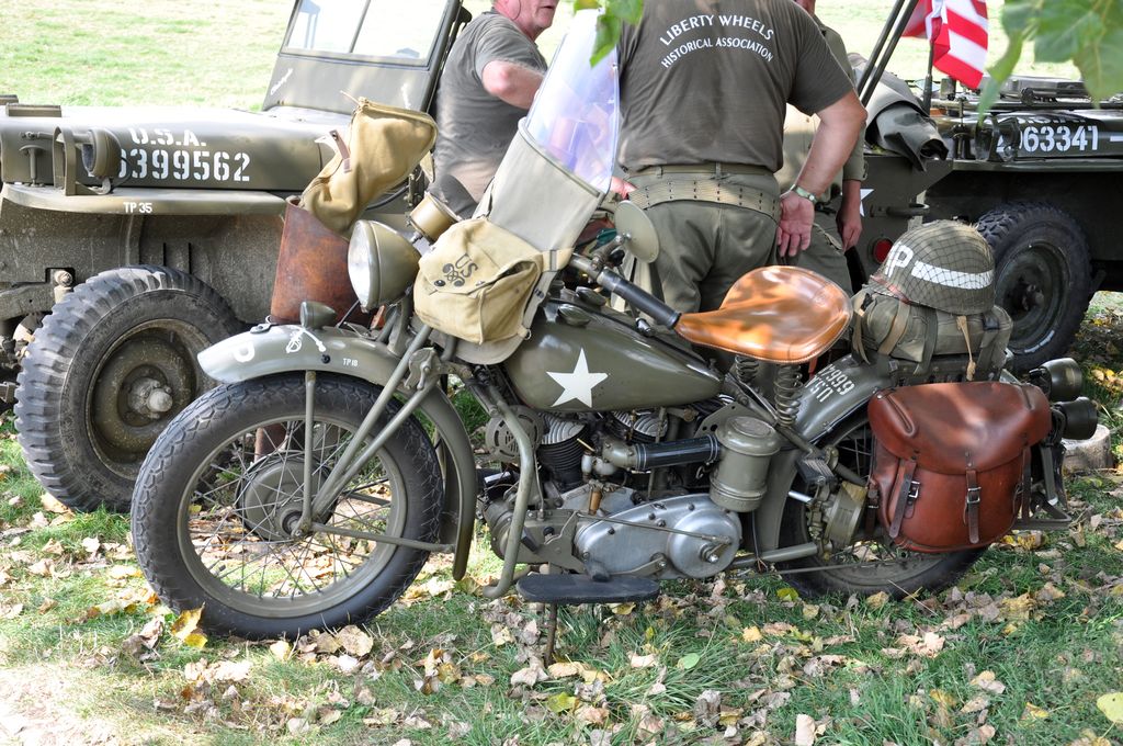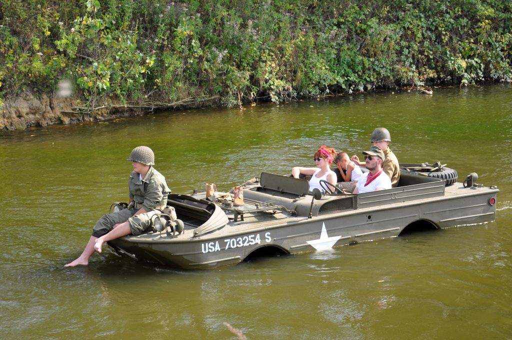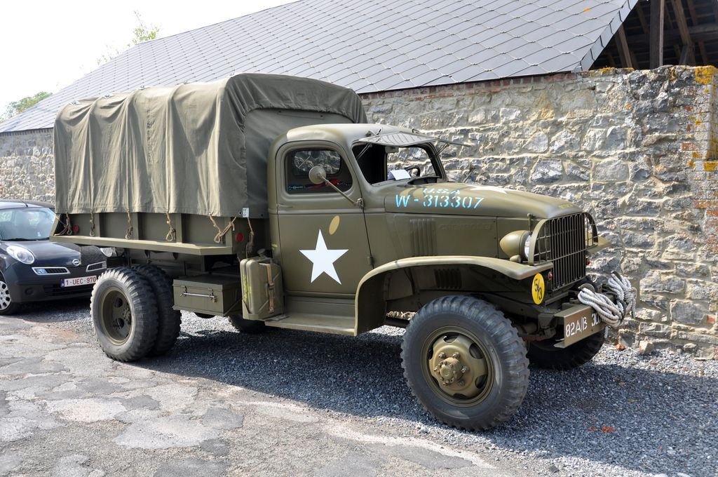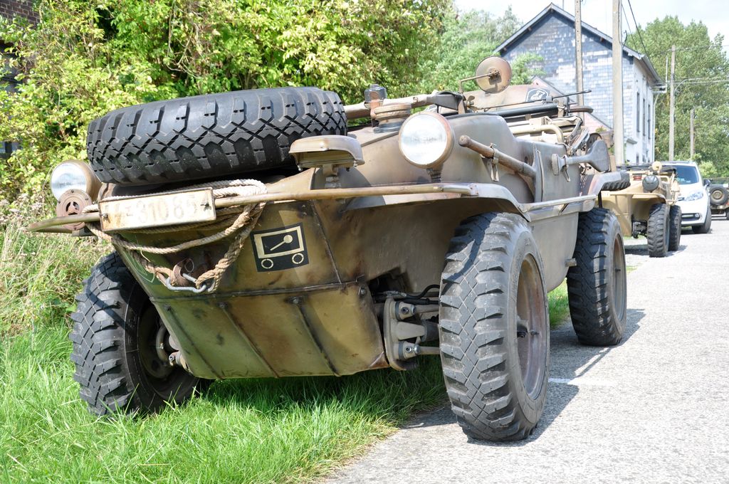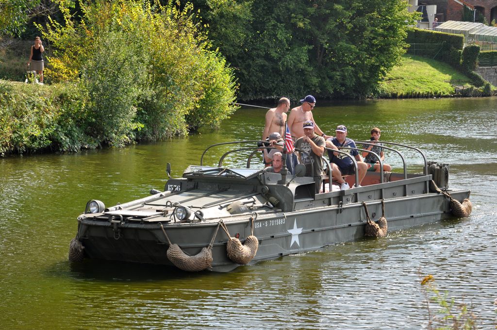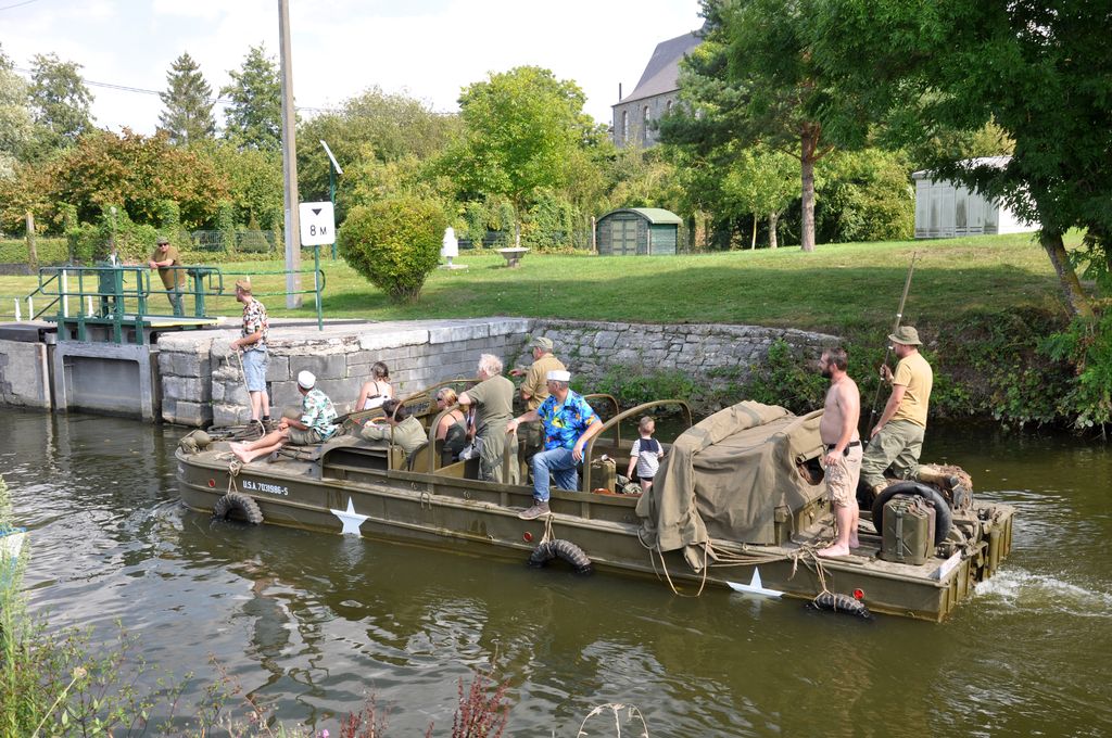 Ayant trouvé le programme sur internet, nous allons du coté de Marpent, côté français de la frontière, où le convoi fait une halte et où les véhicules amphibies sont mis à l'eau. Malheureusement, nous arrivons trop tard et les véhicules sont déjà partis. Nous suivons un Dodge Command Car retardataire qui nous mènera au point d'arrêt suivant, situé quelques kilomètres plus loin au niveau d'une écluse. Une cinquantaine de véhicules y sont stationnés : Jeep Willys, Dodge WC, GMC CCKW dont un transportant un affût Maxon, mais aussi des véhicules un peu moins courants comme des Scout-Car, un Chevrolet G-7107, Ford Canada F15A ou encore une réplique de Sd.Kfz 222. Plusieurs motos sont présentes : Harley-Davidson WLA, mais aussi une moins courante Indian 741 ou une NSU allemande.