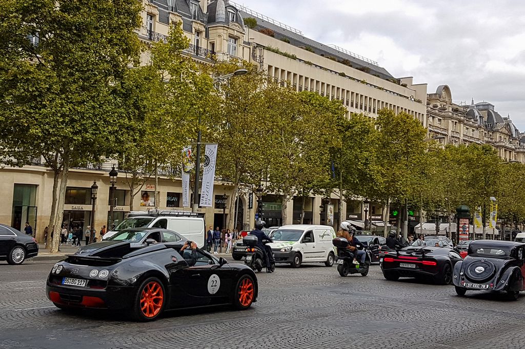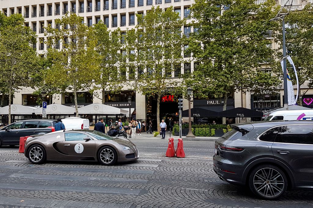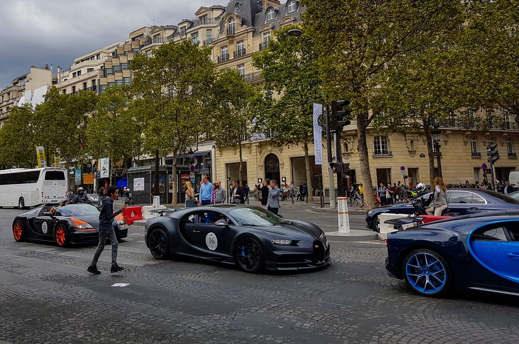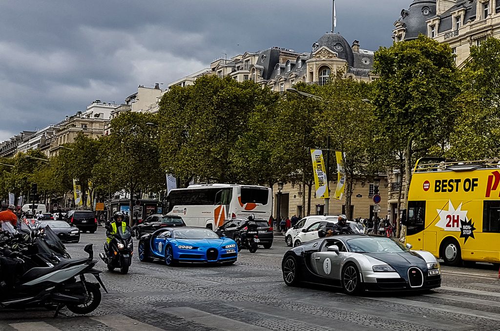 Avec tout cela il est déjà 15h30, je décide d'aller vers les Champs-Elysées pour prendre le métro et aller du côté de la place Vendôme où quelques Bugatti seraient déjà arrivées. C'est là que je tombe nez à nez avec le cortège ! Quelques anciennes ouvrent la voie, et une vingtaine de Veyron et Chiron suivent ! Cette vision est à peine croyable. Plusieurs Porsche Panamera et Cayenne, ainsi que des motos accompagnent le convoi.