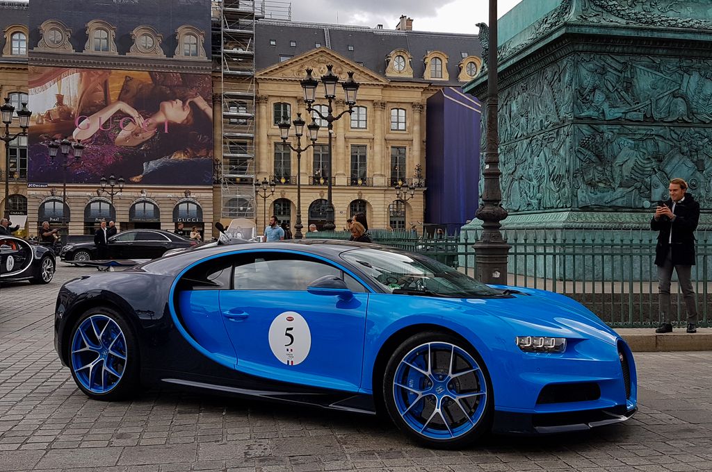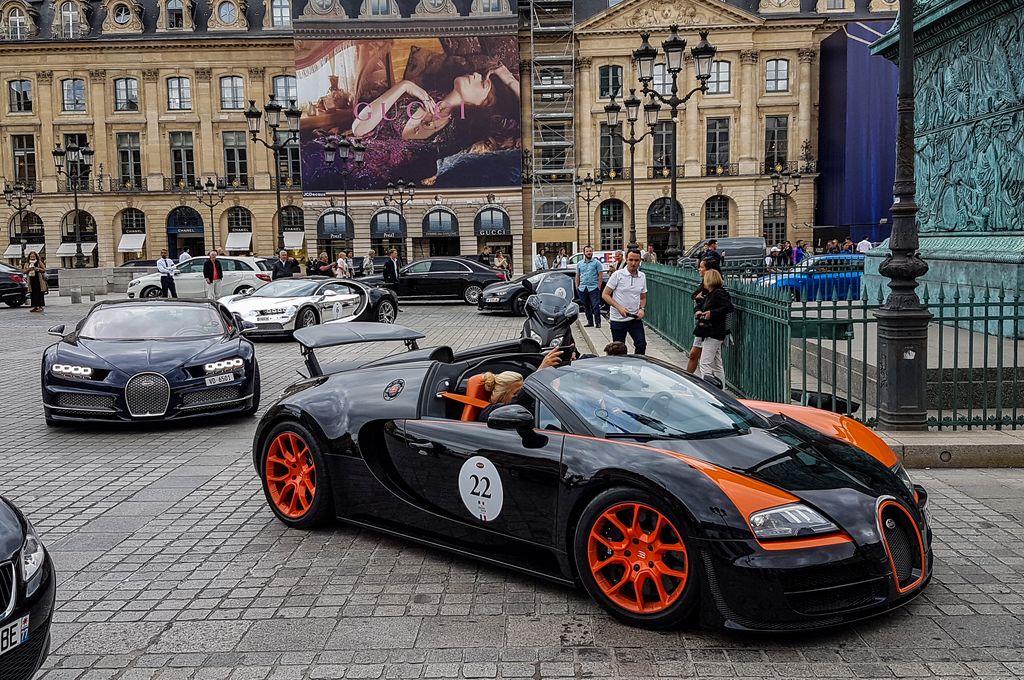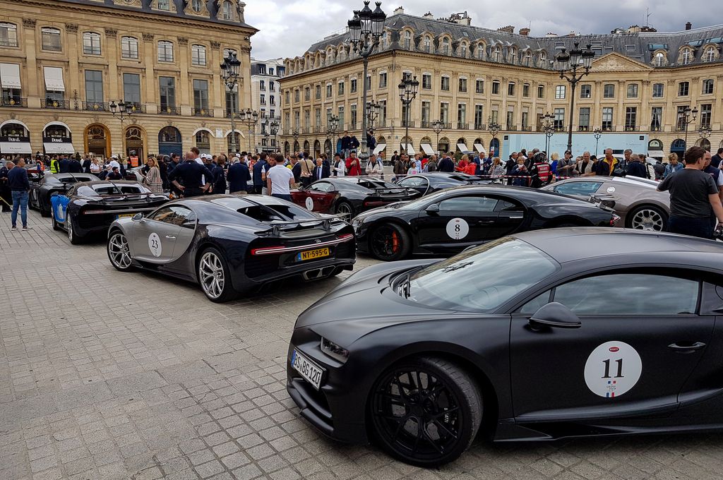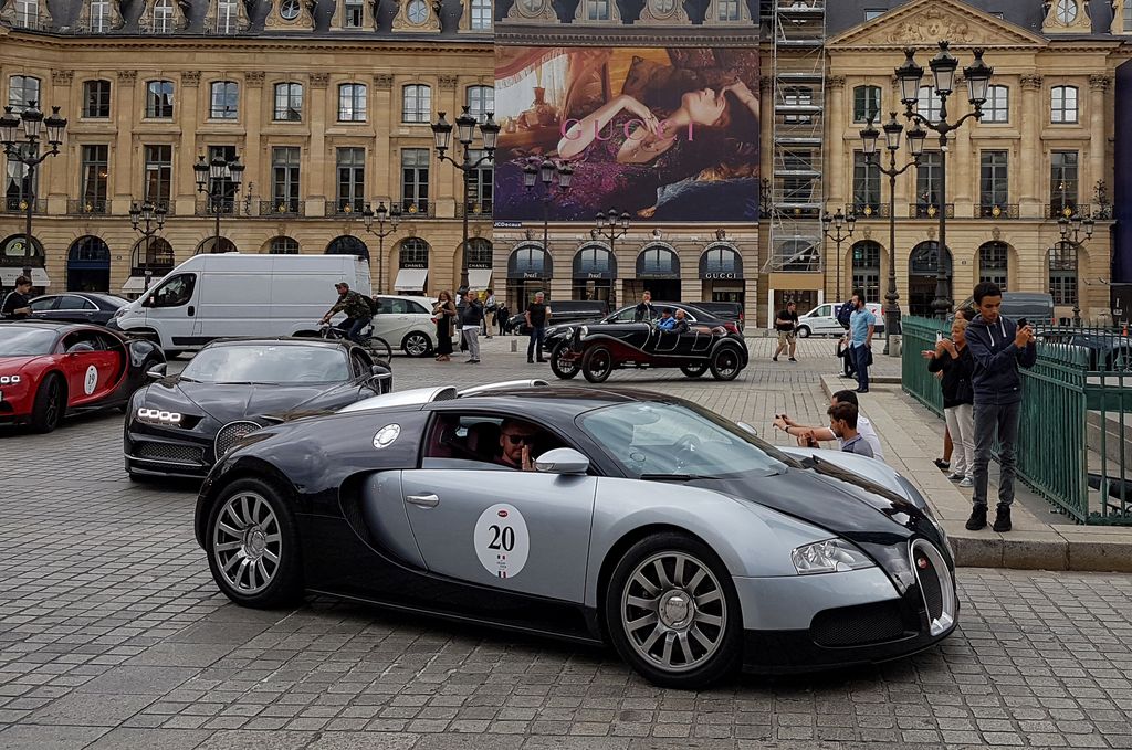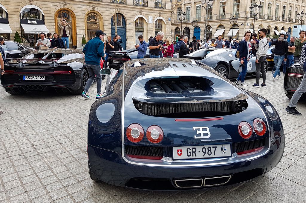 Avec tout cela il est déjà 15h30, je décide d'aller vers les Champs-Elysées pour prendre le métro et aller du côté de la place Vendôme où quelques Bugatti seraient déjà arrivées. C'est là que je tombe nez à nez avec le cortège ! Quelques anciennes ouvrent la voie, et une vingtaine de Veyron et Chiron suivent ! Cette vision est à peine croyable. Plusieurs Porsche Panamera et Cayenne, ainsi que des motos accompagnent le convoi.