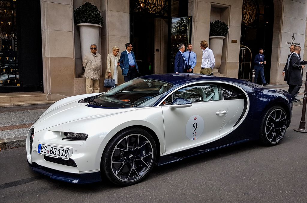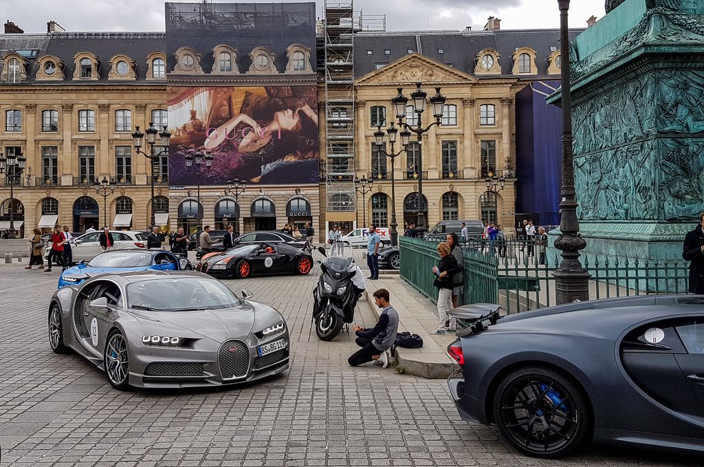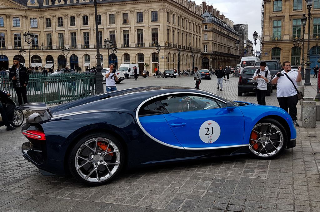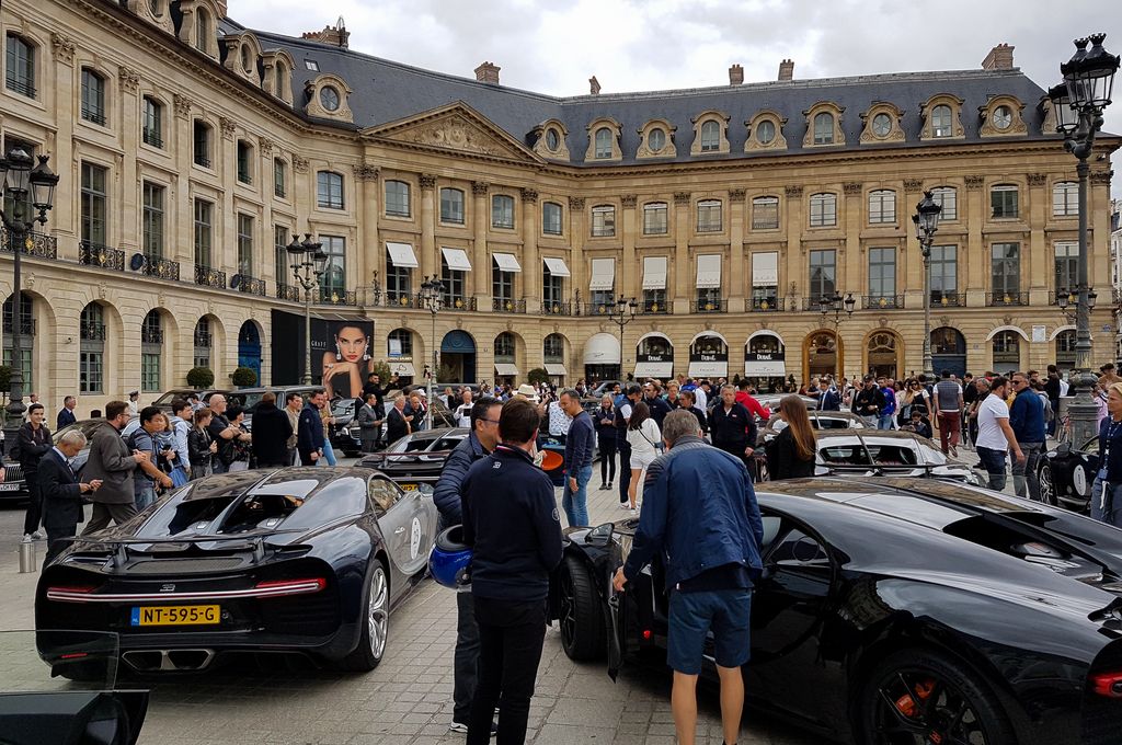 Le midi, toujours sur les réseaux sociaux, je vois qu'une Bugatti Chiron a rejoint les 918, Huyara et LaFerrari, et qu'une Koenigsegg Regera est censée arriver sous peu ! Je pars donc sur la pause du midi en direction de l'hôtel George V pour observer ce cortège. On peut dire que ça impressionne... Je remarque sur la Chiron un numéro. J'avais repéré il y a quelques jours, qu'il y avait un rallye dans le sud de la France avec énormément de Bugatti modernes, le Bugatti Grand Tour, qui fête les 110 ans de la marque. Je me dis que c'est un des participants qui repasse par ici. Après discussion avec un spotter, j'apprends que le rallye passe par la captitale et arrive aujourd'hui ! Avec passage sur les Champs-Elysées et rassemblement place Vendôme. Il y a des jours où ça vaut le coup de se déplacer !