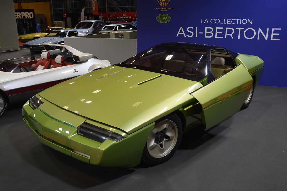 Plusieurs expositions sont dispersées au sein du salon, comme ici, une exposition consacrée aux concepts car Bertone : Chevrolet Ramarro de 1984, Runabout de 1969, Suzuki Go de 1972, BMW Pickster de 1998, Lamborghini Genesis de 1988 (monospace équipé d'un V12 Lamborghini !), Volvo Tundra de 1979-retromobile-2020 (qui préfigure la BX de... Citroën !) ou encore Ferrari Rainbow de 1976.