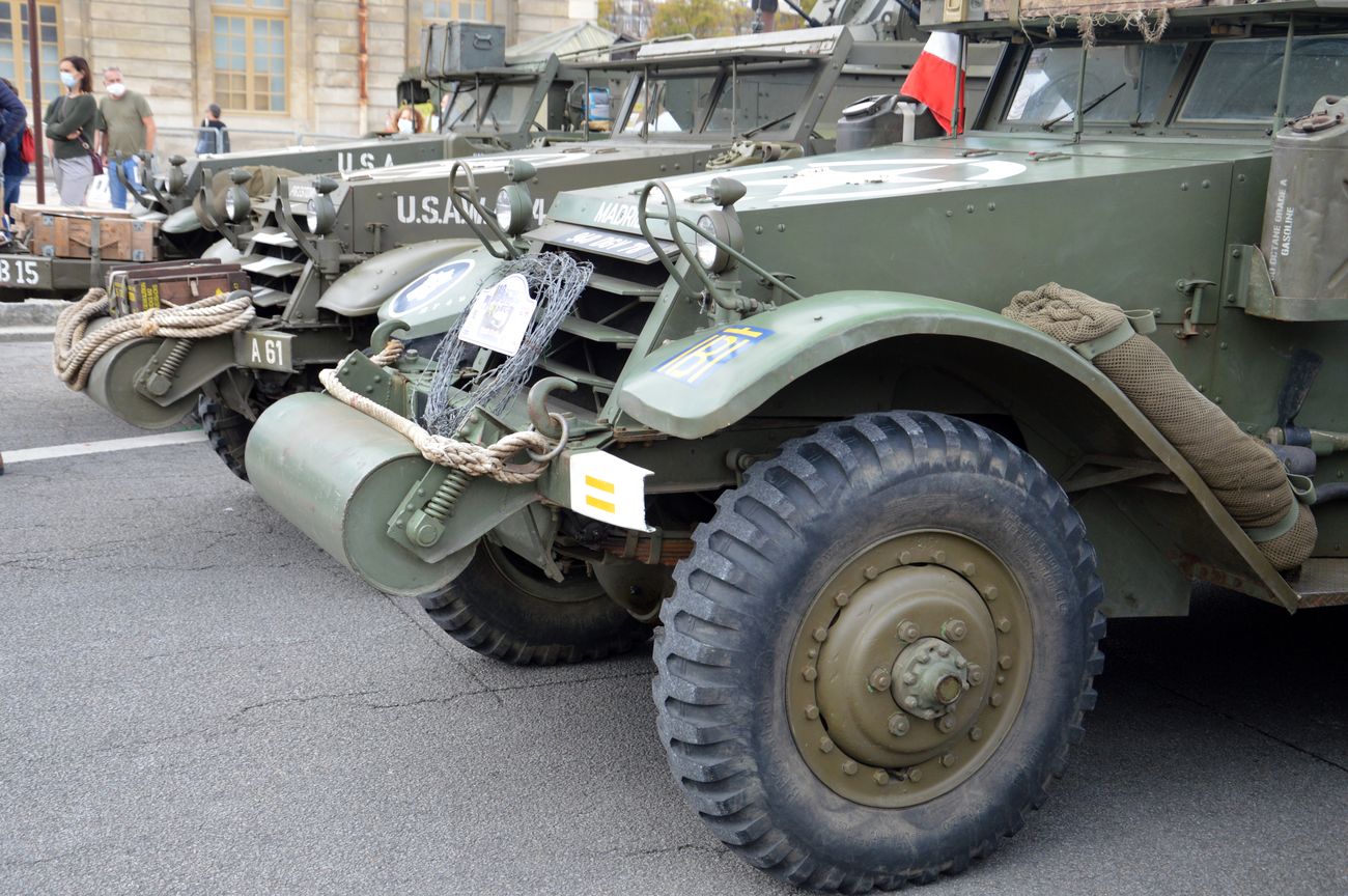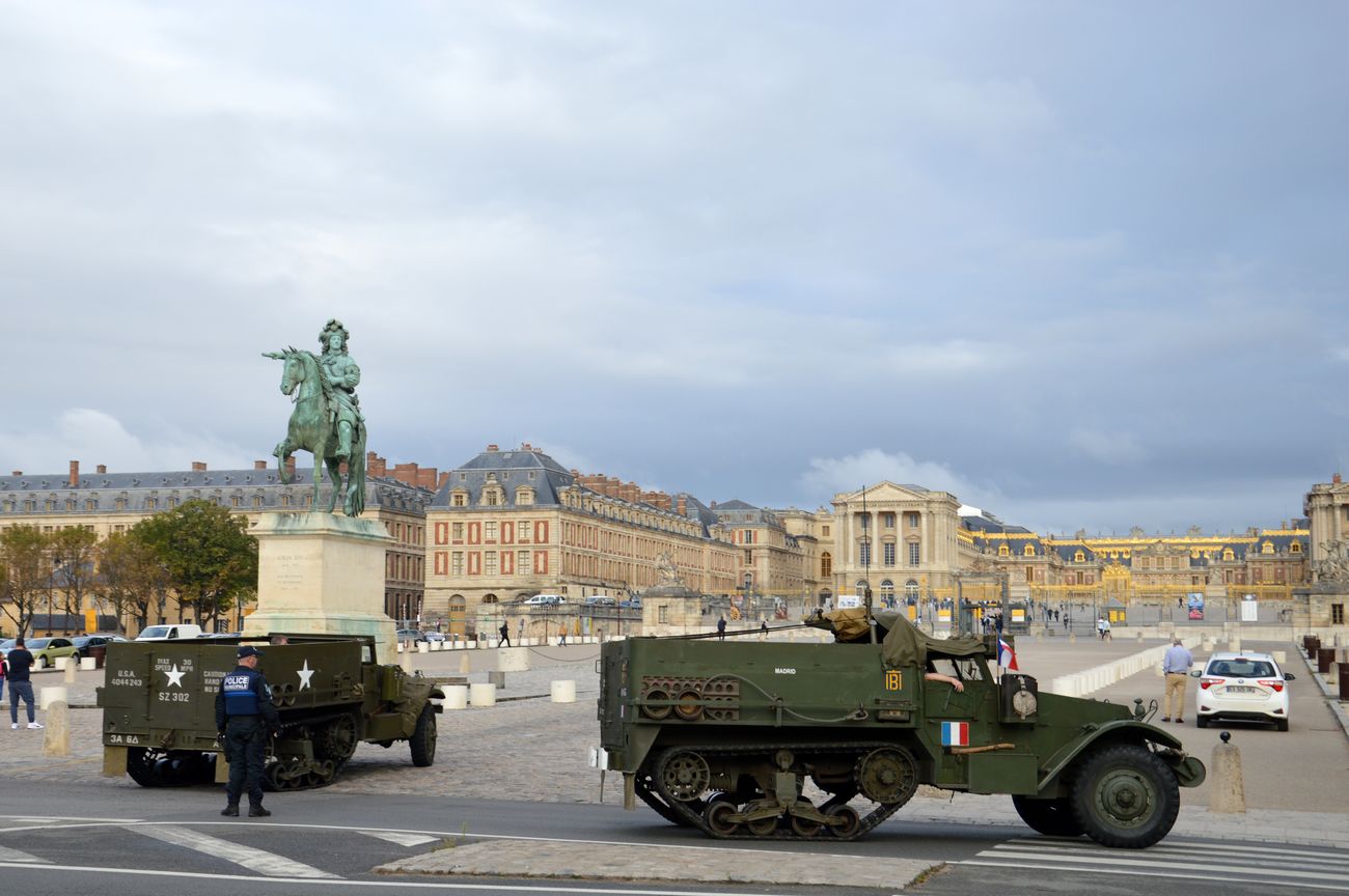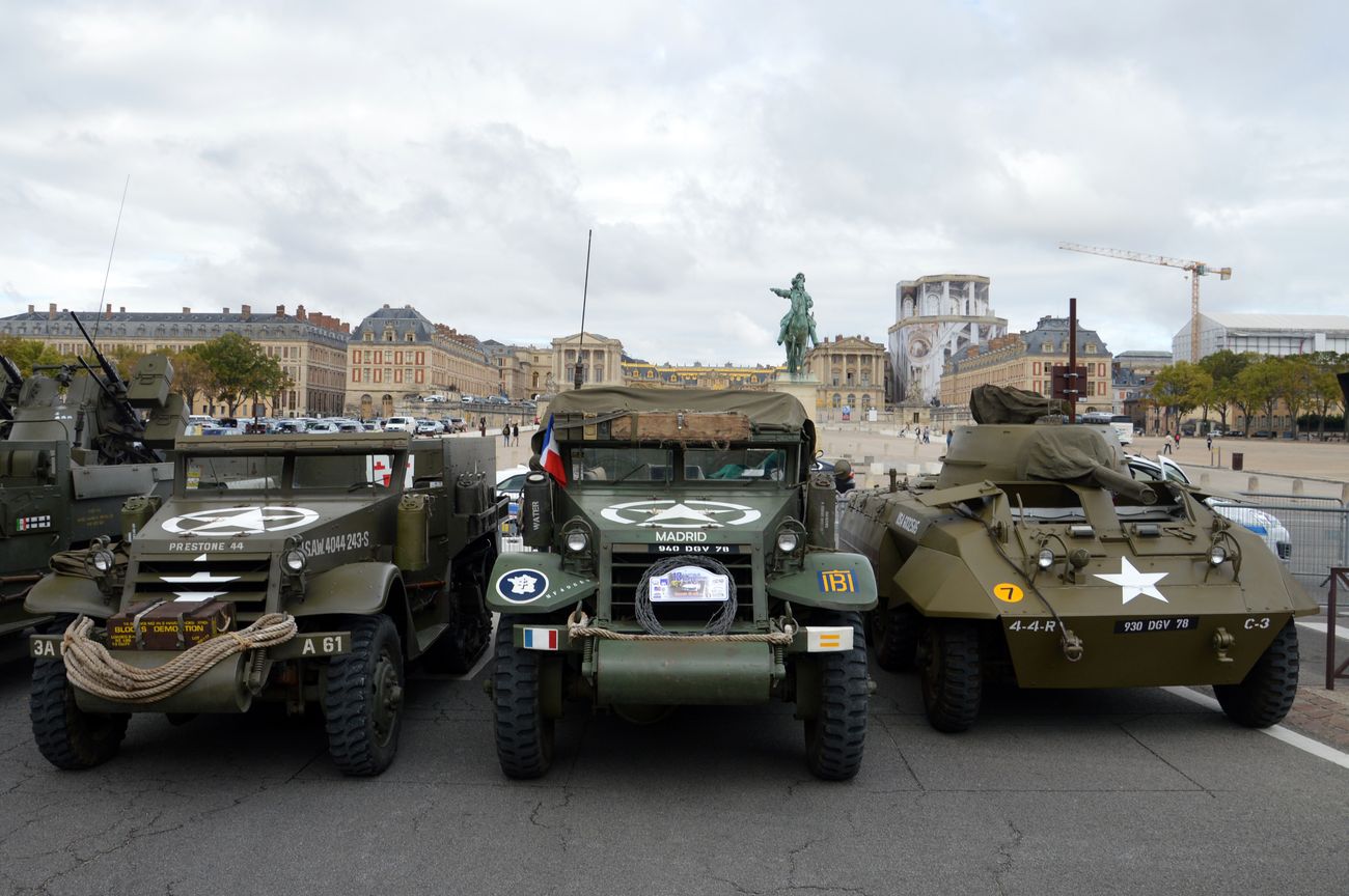L'arrivée des Half-Track devant le château de Versailles et l'alignement des véhicules le long de l'avenue de Paris avant qu'ils ne soient placés en bout de l'avenue de Paris, face au château, pour servir de barrage anti-voiture-bélier. Egalement un Unimog appartenant à une association de scouts.