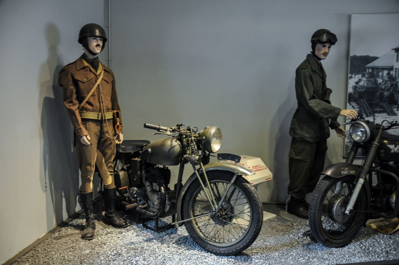Tous ces chars "pots de fleurs" ne sont plus en état de fonctionnement, alors que le second bâtiment héberge la collection du musée toujours en état de rouler. Tout d'abord, la période de la libération de 1944/45 est évoquée avec ce Daimler Dingo et ces motos Royal Enfield.