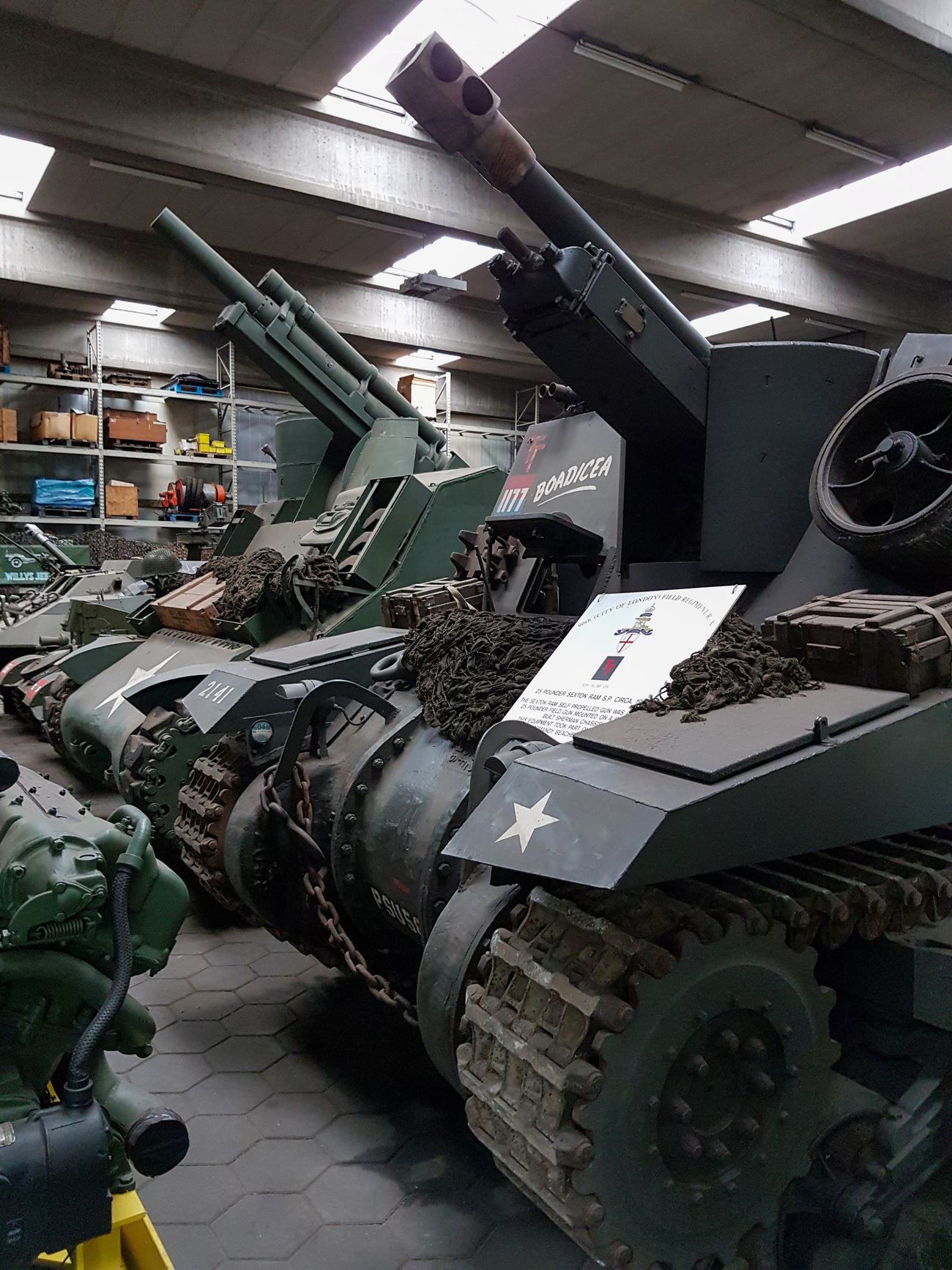 Et quelle collection ! Une centaine de véhicules répartis dans différents hangars. Ici, plusieurs blindés : M7B2 Priest, Sexton, M36 Jackson, Ford M20, Sherman M74, Chieftain,... et quelques camions, certains extrêment rares, à l'image de ce FWD HAR-1 et ce Dodge Canada D8A !