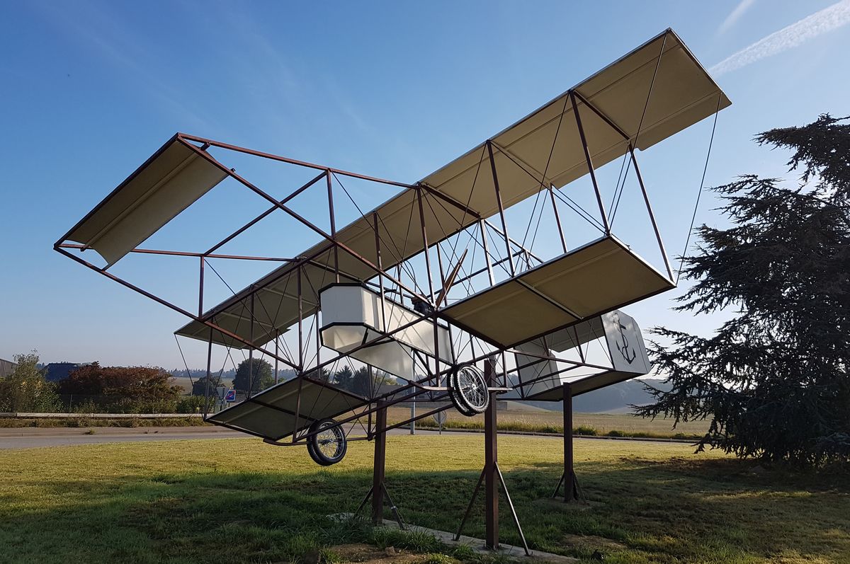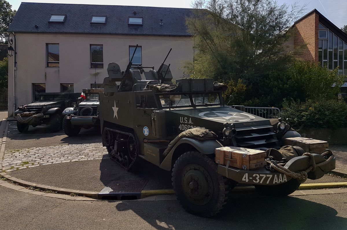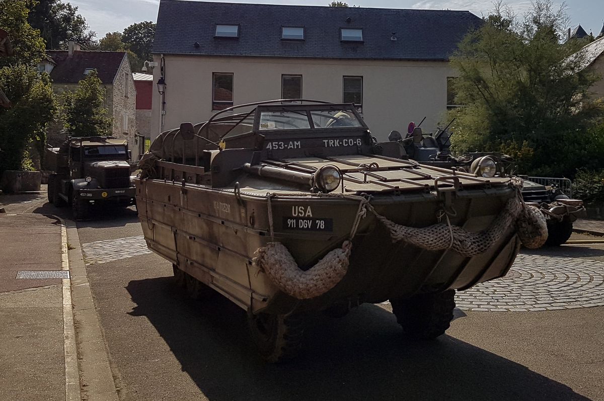 Arrivés sur place, je m'occupe de décharger le Sherman, et nous mettons les véhicules en place autour du rond-point du Trou Salé, où une maquette d'avion Farman MF10 a récemment été installée.