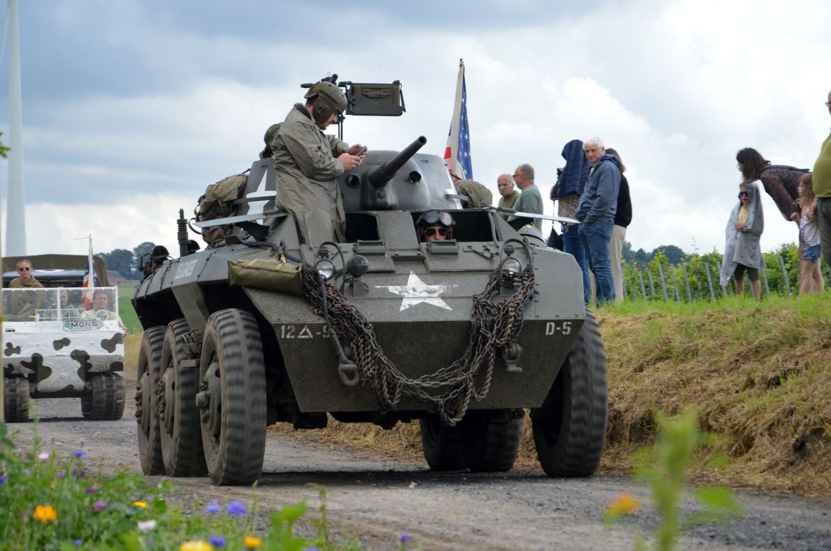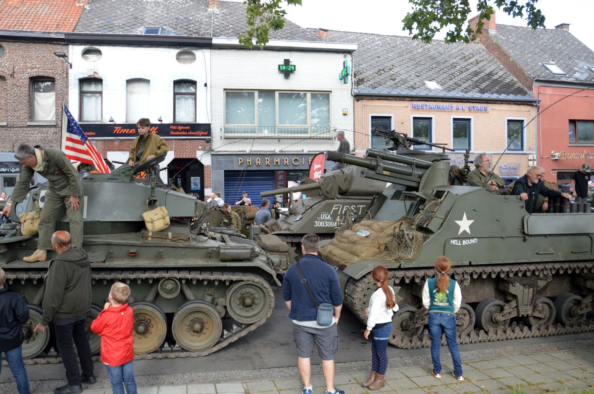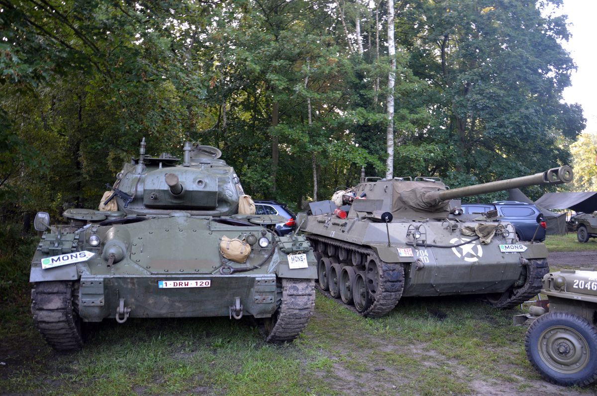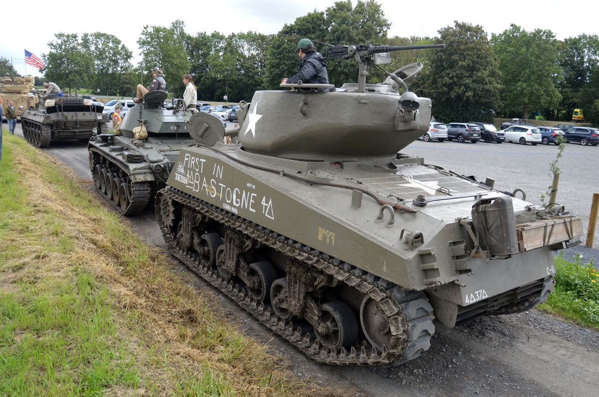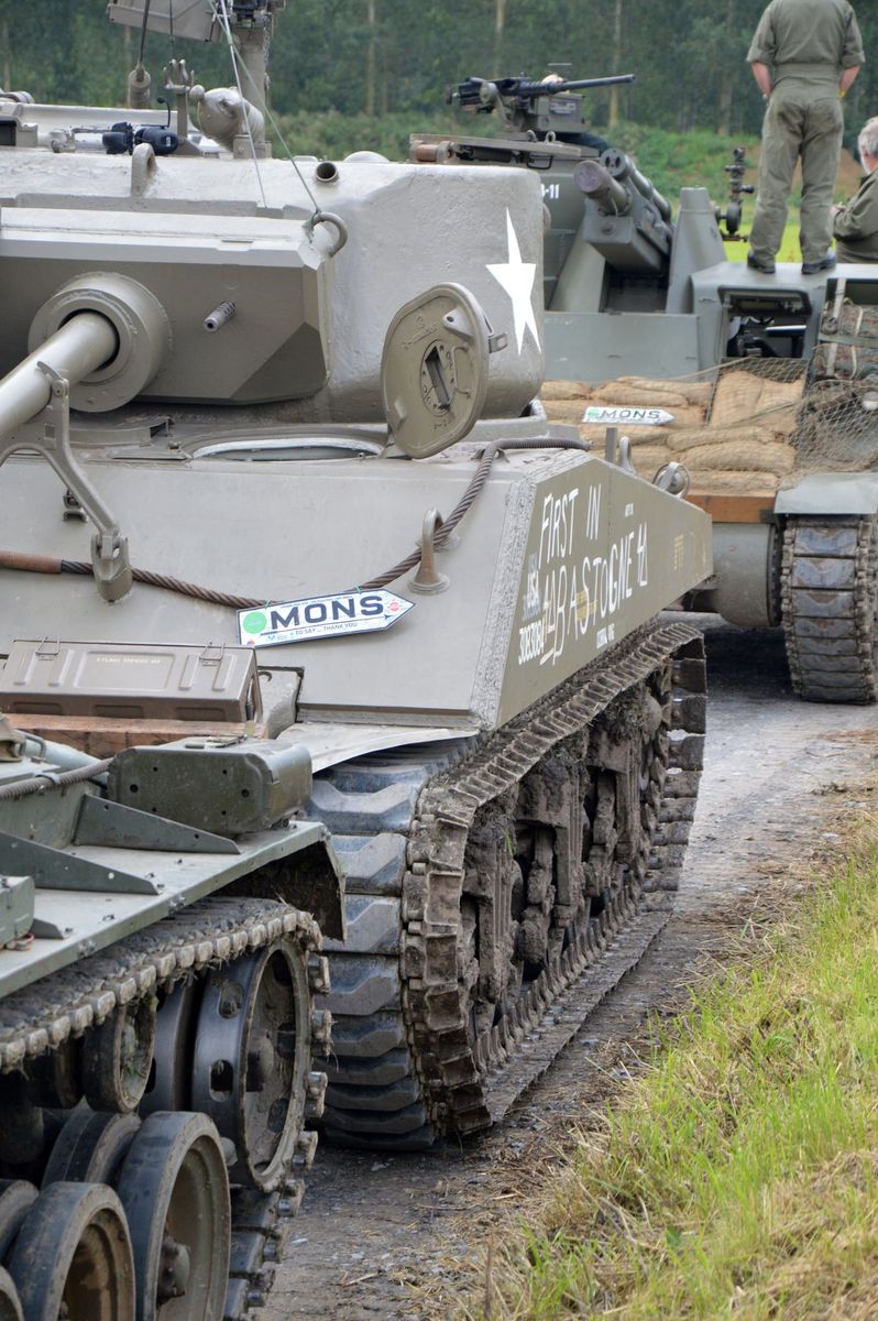 Nous arrivons tôt le matin au site du Bois-Brûlé, où le camp de base est établi, avant que le convoi ne parte pour la journée. A l'entrée, un Bradley de l'Armée Américaine accueille les visiteurs. En poursuivant dans le camp, on tombe sur les autres chars : Sherman M4A1/Grizzly "Ô Saint-Georges" et Stuart M5A1 "Fish'n'Chips" de la ville de Mons ou encore ces M24 Chaffee et M18 Hellcat de collectionneurs privés. Un M10 Achilles était également à voir, mais resté bâché, il ne sortira pas de la journée.