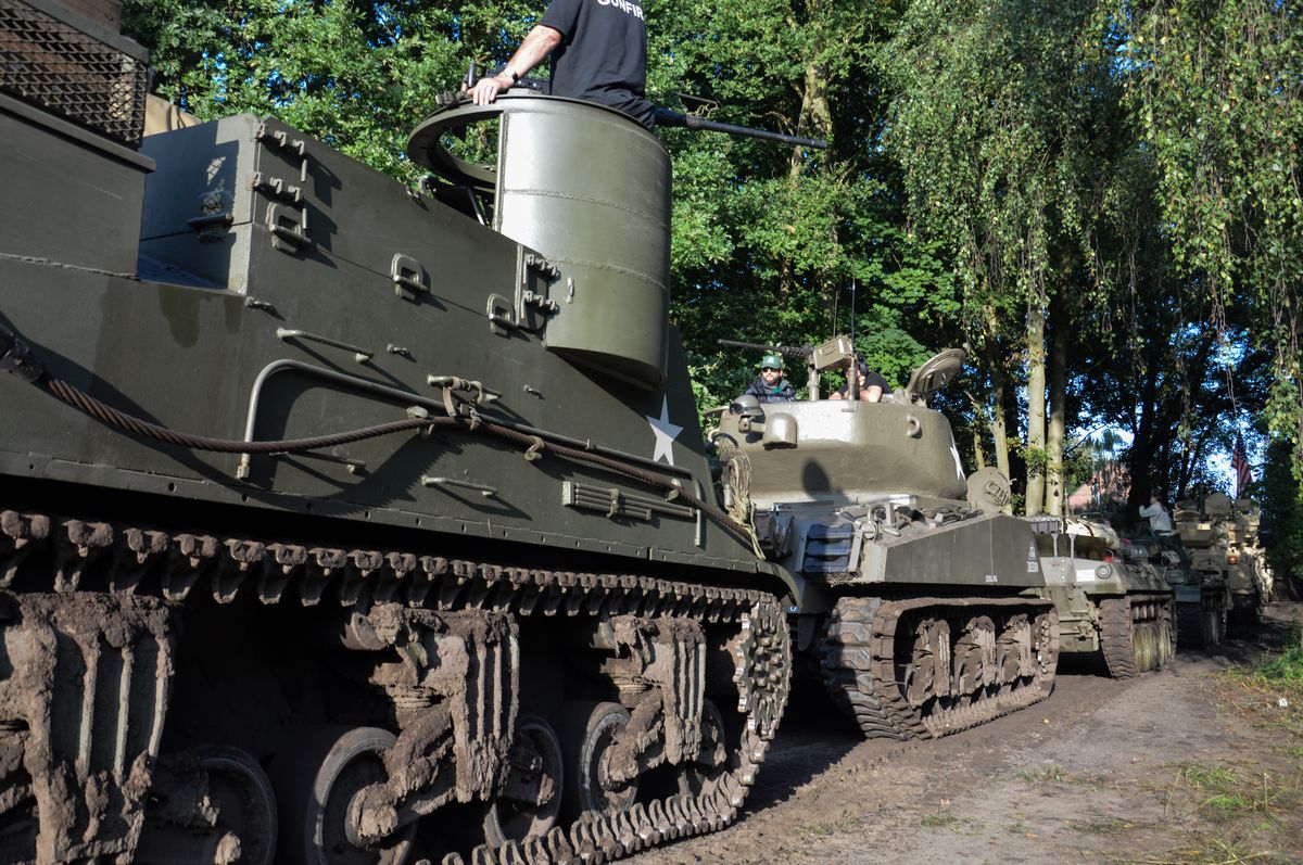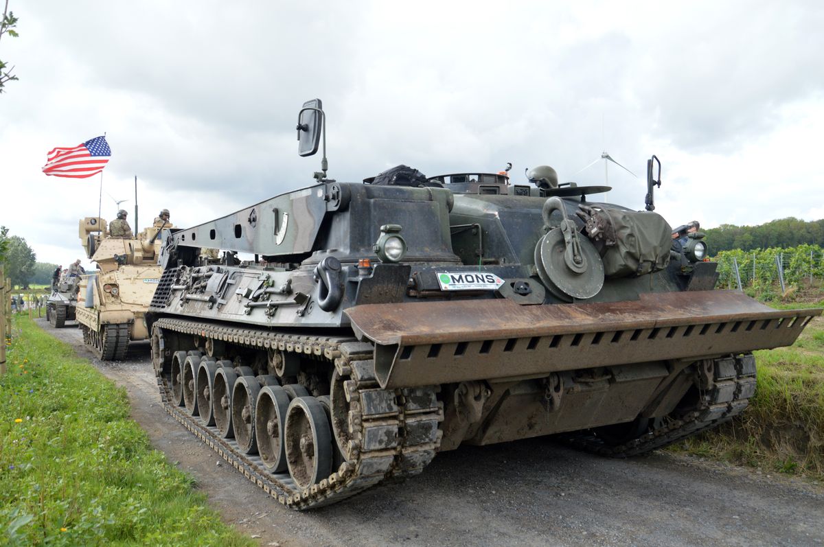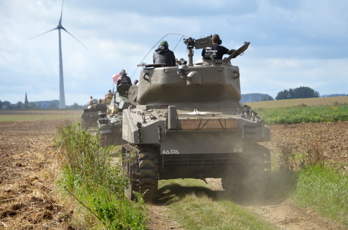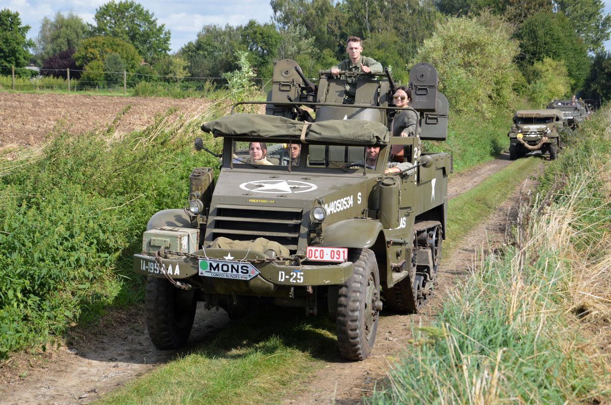 Nous arrivons tôt le matin au site du Bois-Brûlé, où le camp de base est établi, avant que le convoi ne parte pour la journée. A l'entrée, un Bradley de l'Armée Américaine accueille les visiteurs. En poursuivant dans le camp, on tombe sur les autres chars : Sherman M4A1/Grizzly "Ô Saint-Georges" et Stuart M5A1 "Fish'n'Chips" de la ville de Mons ou encore ces M24 Chaffee et M18 Hellcat de collectionneurs privés. Un M10 Achilles était également à voir, mais resté bâché, il ne sortira pas de la journée.