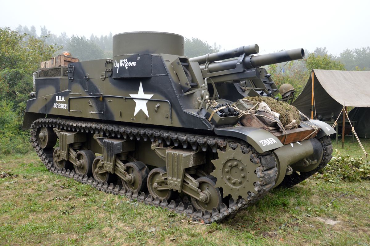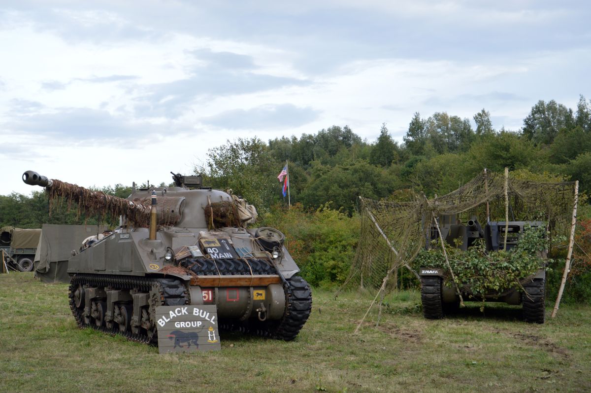Nous faisons un tour dès le vendredi soir pour voir ce qui est arrivé dans la journée. Pas moins de cinq blindés à chenilles américains sont présents, certains portés au standard britannique : Sherman M4 105mm, Sherman M4A1 76mm, Sherman M4A4 Firefly, Priest M7B1 et Ford T16.