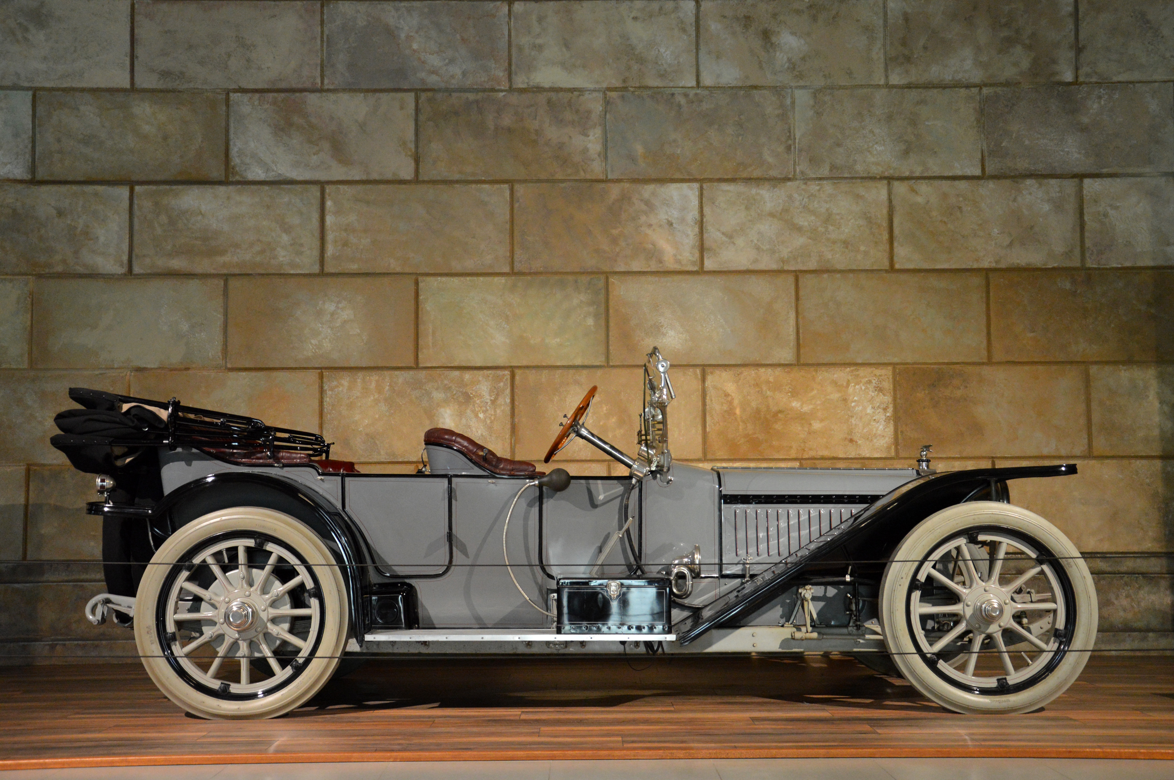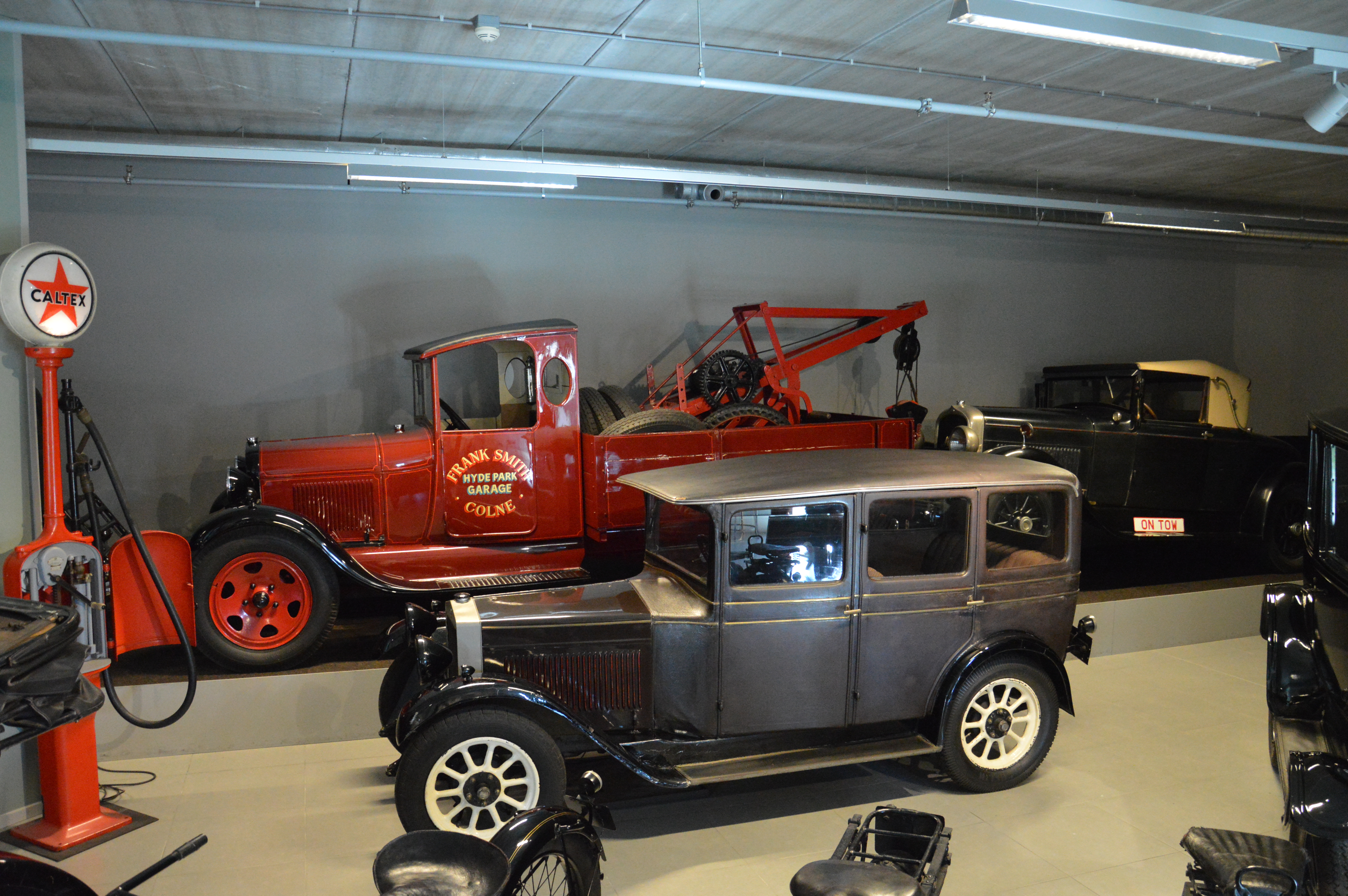 Différentes alcoves : une Dodge de 1914,la première voiture à être entrée dans la collection, une Franklin 11B tractant une caravane, ou une Lancia Lambda.