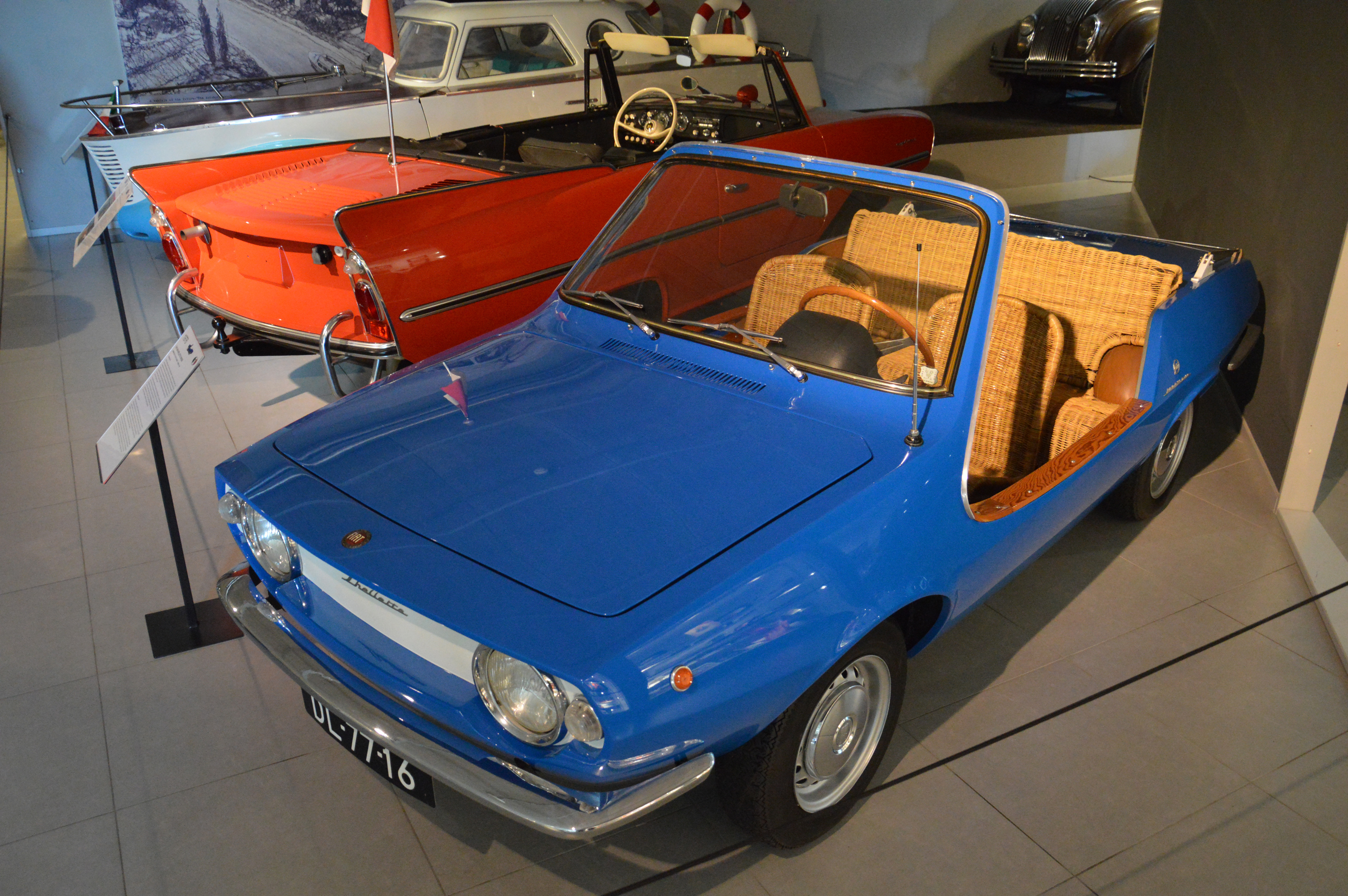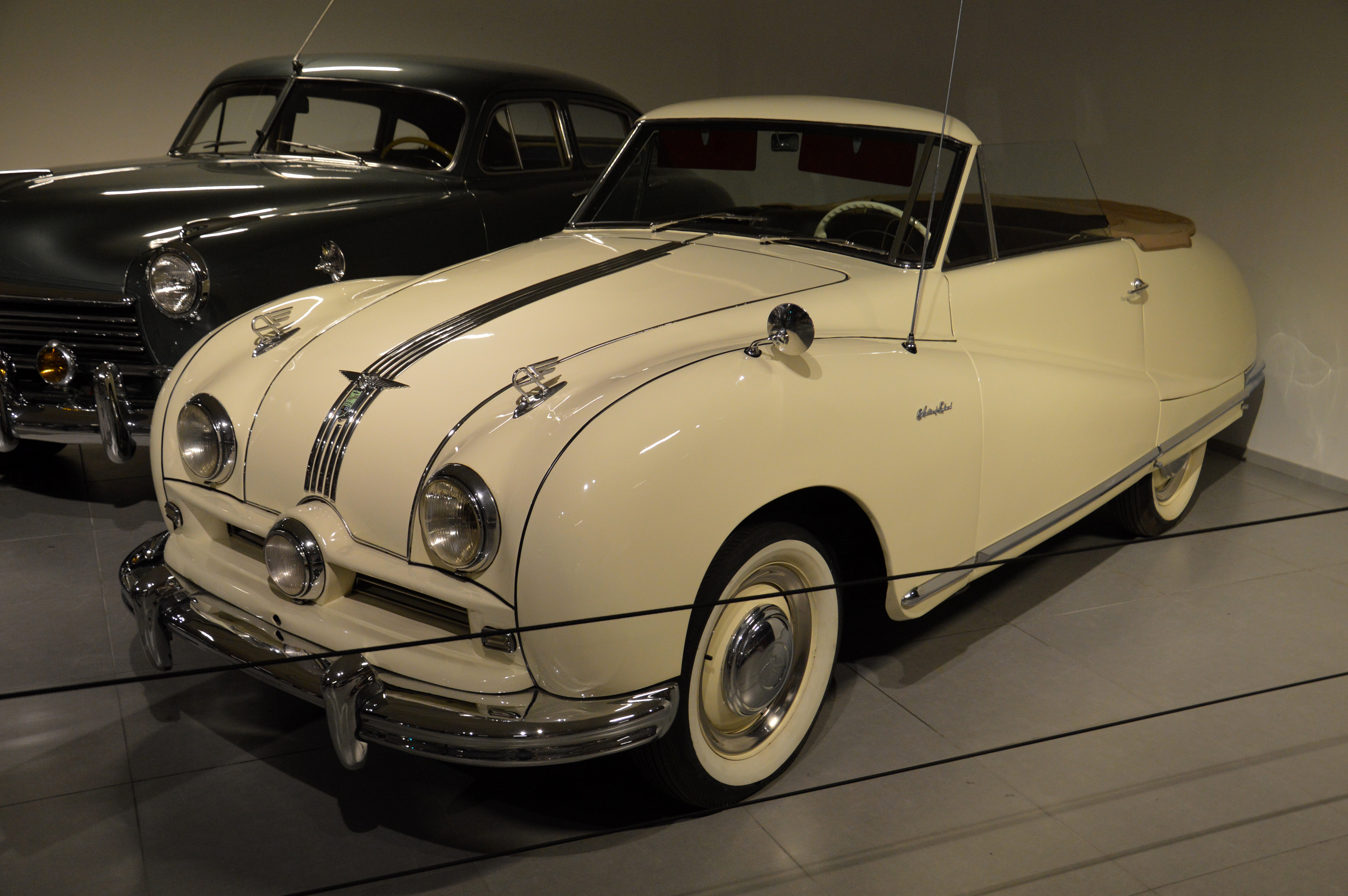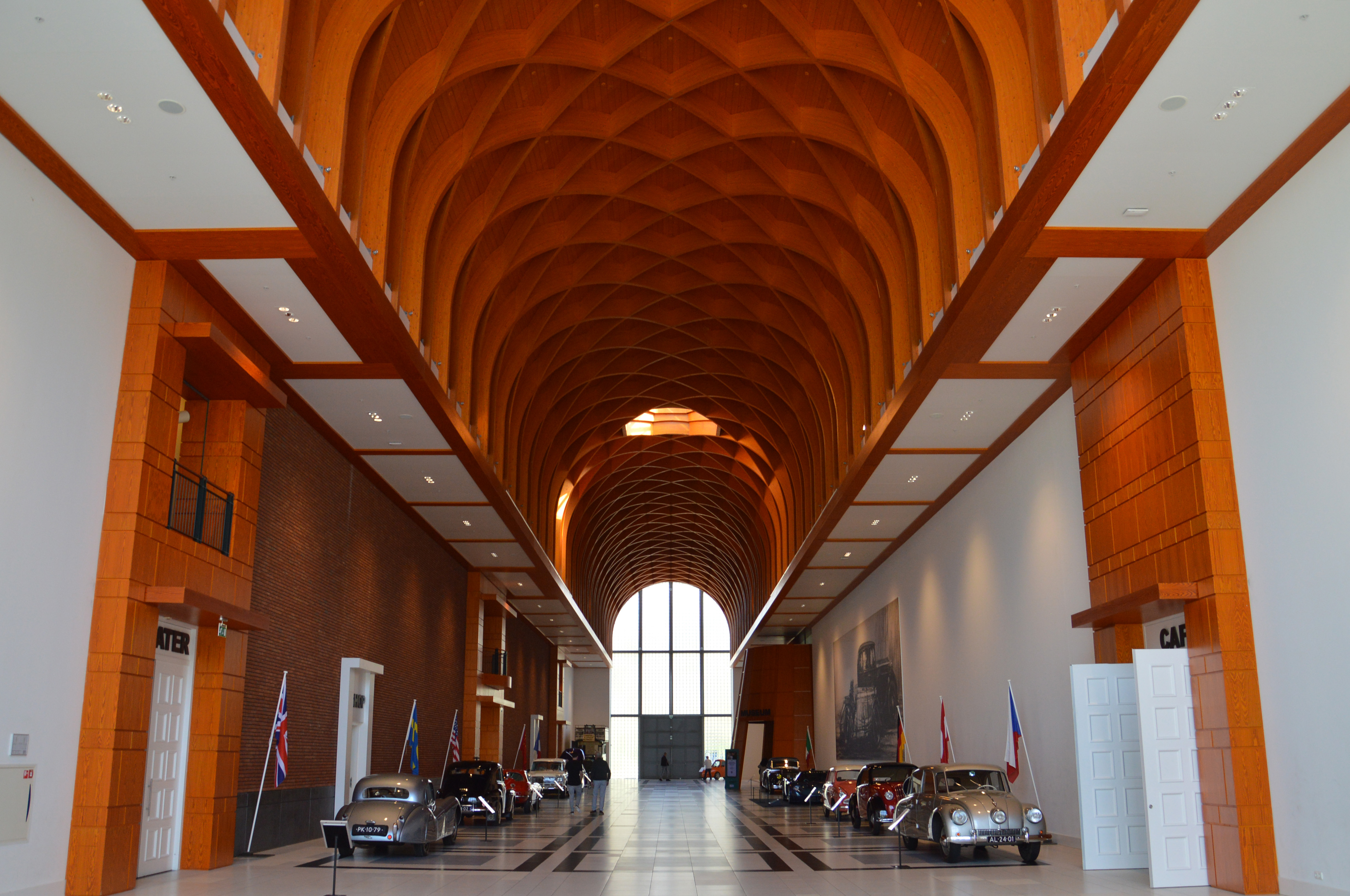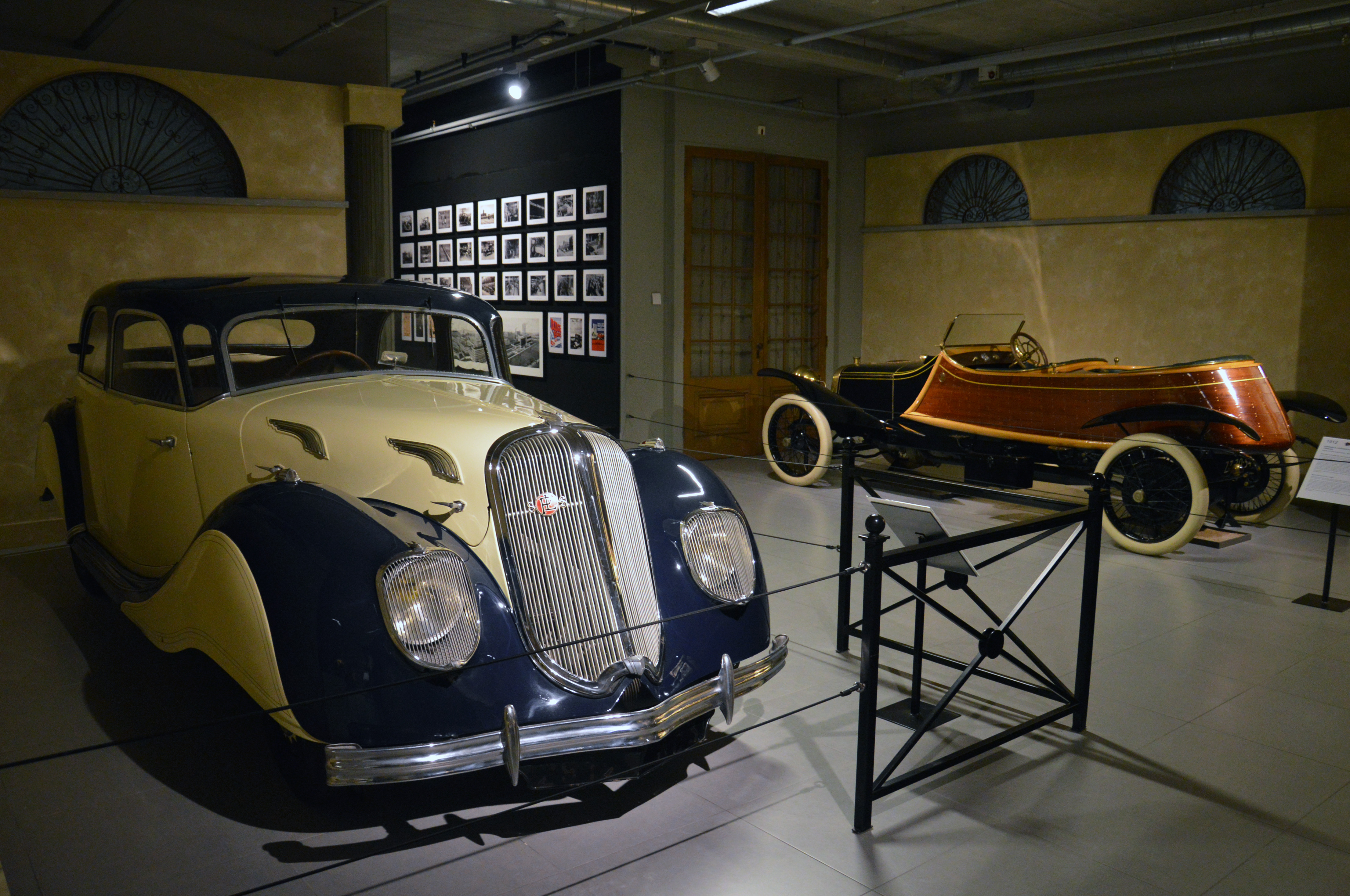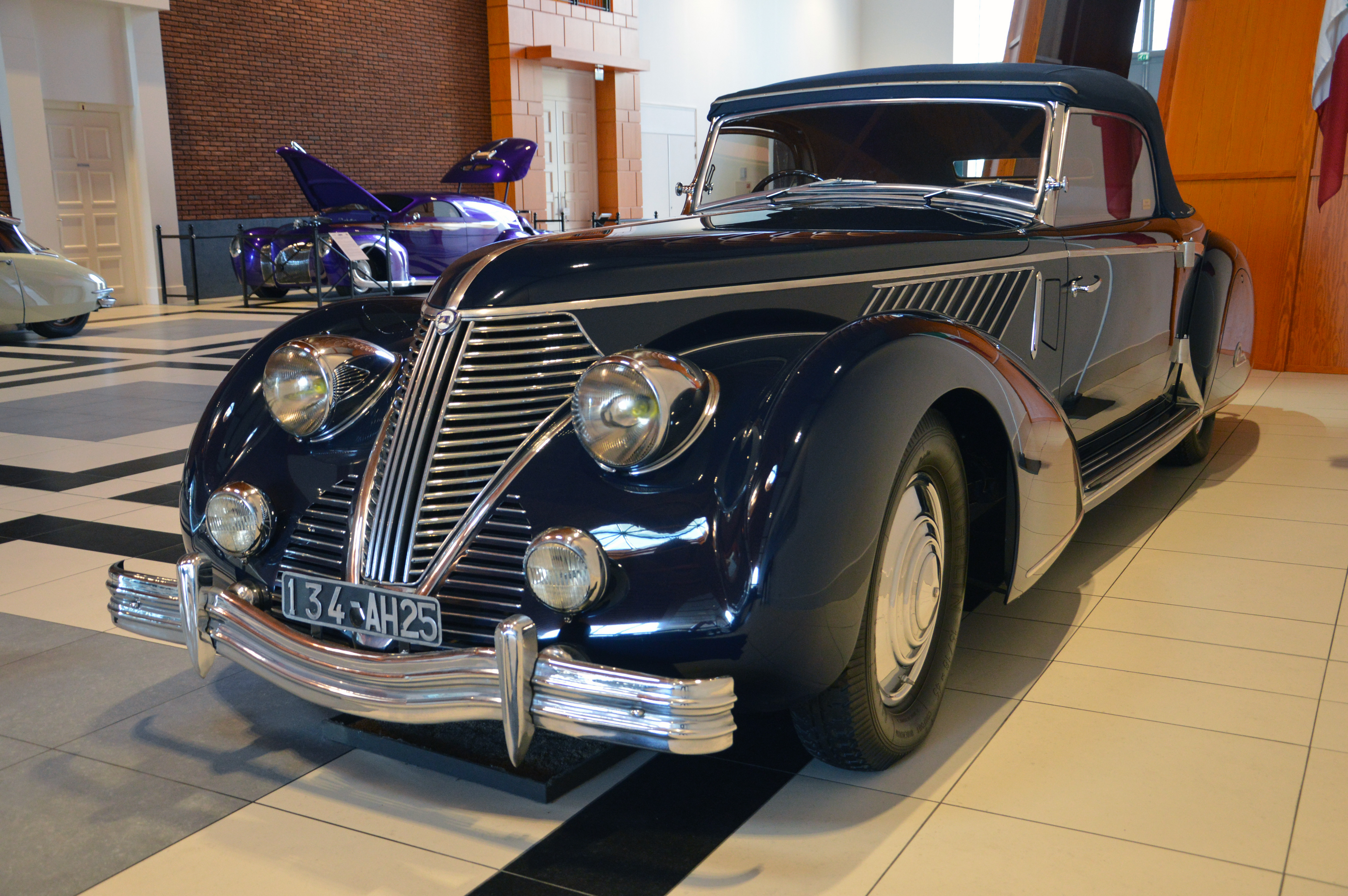 Dans le hall d'entrée, plusieurs pays sont représentés par une voiture. Une Citroën DS pour la France par exemple. Ici, l'Italie (Lancia Astura), la République Tchèque (Tatra 87), les USA (Corvette C2), ou le Japon (Toyota 2000 GT).