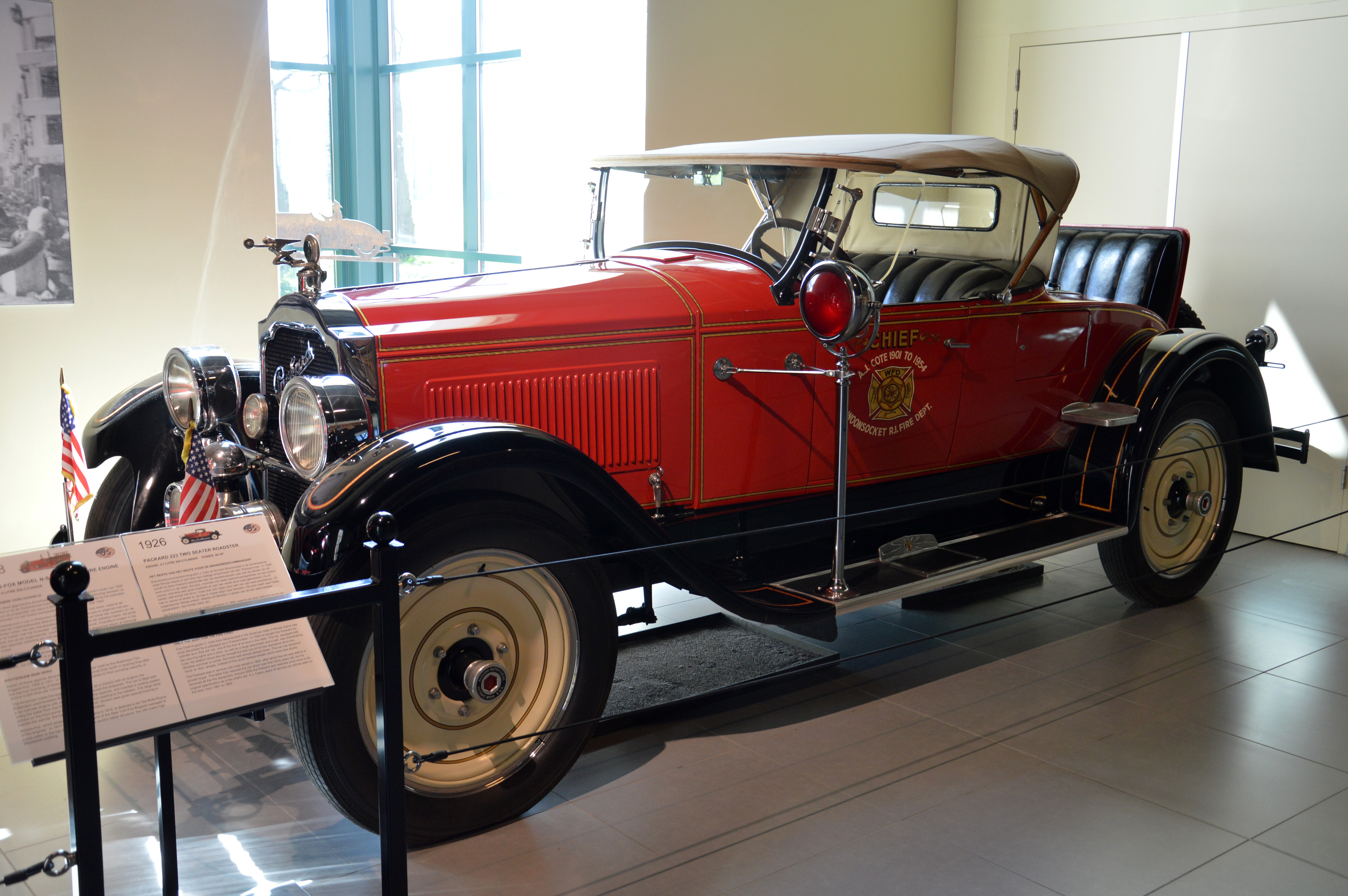 Une partie consacrée aux véhicules de pompier : American La France de 1922, Packard 223 ou Ahrens-Fox Model N-S-2.