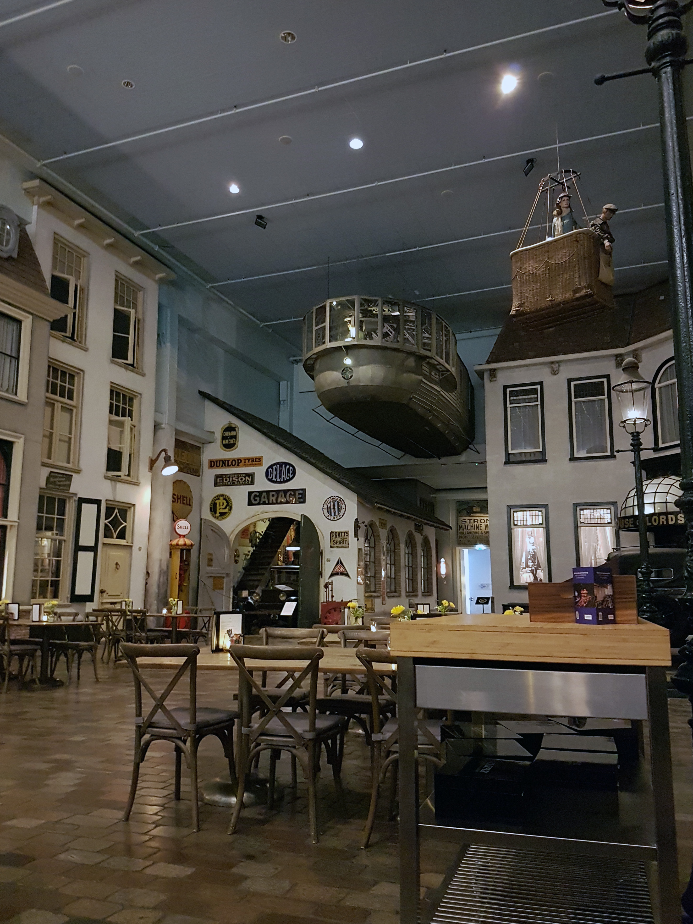 Avant de poursuivre les autres étages, nous allons au restaurant qui est lui aussi une expérience en lui même, avec une reproduction de rue des années 30, avec ses habitations, ses magasins, ses garages,... et même en levant les yeux, on put voir un avion, ou une cabine de dirigeable.