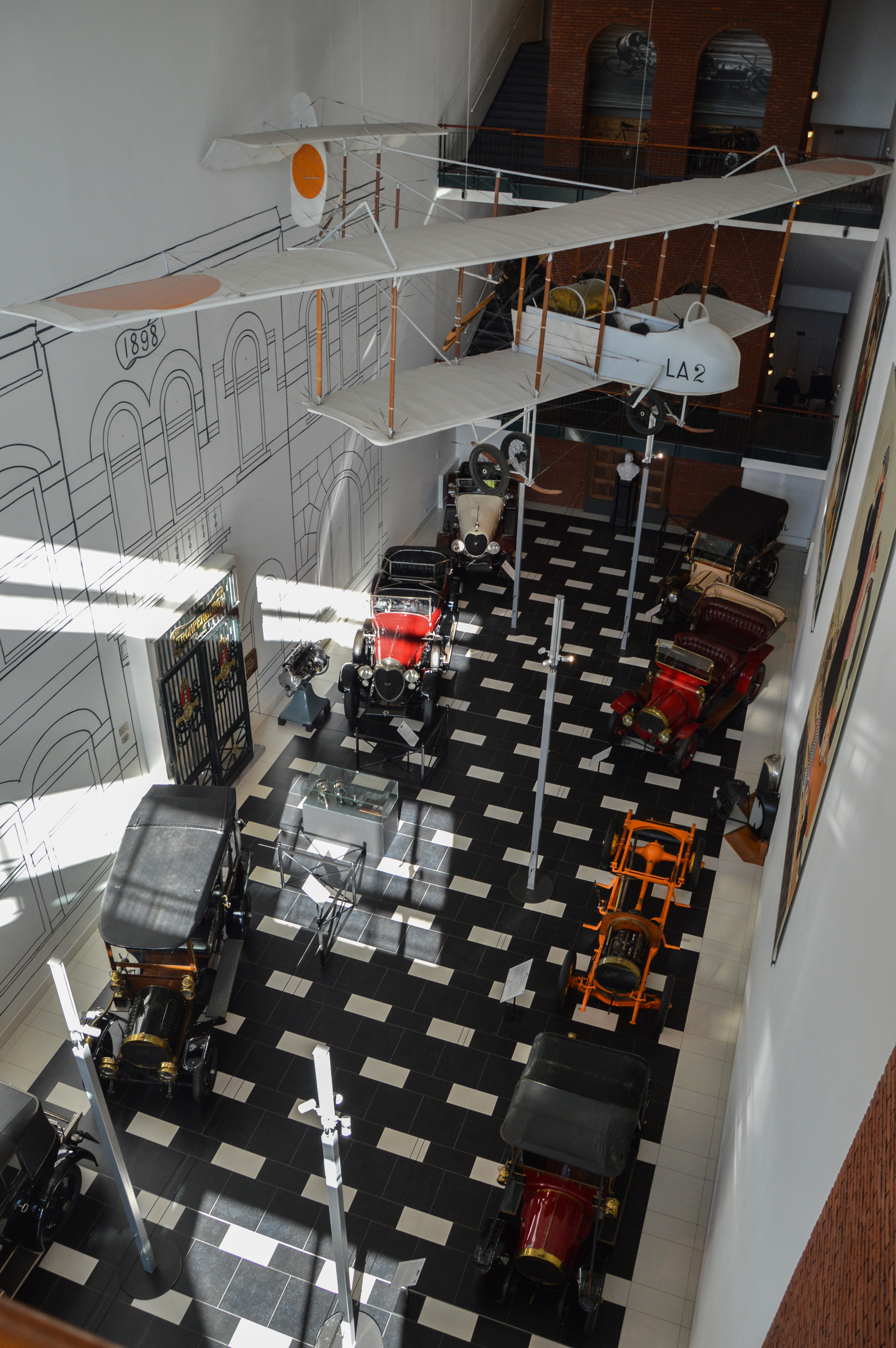 On passe ensuite dans une salle remplie de Benz, puis sur une passerelle qui donne une vue sur un avion Farman et différentes Spyker.